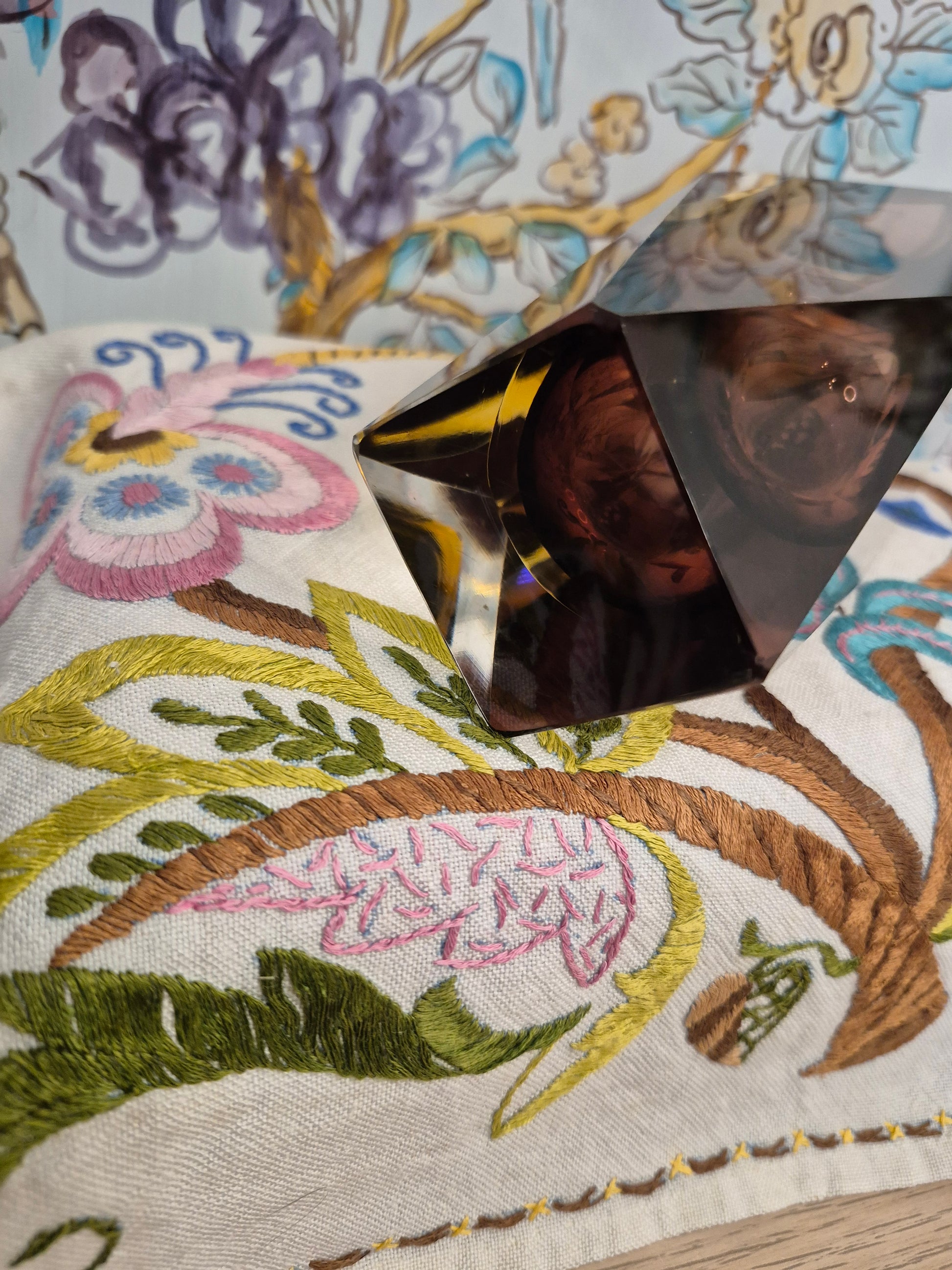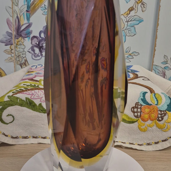 A stunning Murano Sommerso Vase designed by Flavio Poli c1960s. The vase features aubergine coloured glass encased in a layer of yellow glass which is then encased in a layer of clear glass. The vase has a beautiful faceted design and heavy base. It is in excellent condition although there is a tiny nick on one corner (see last photo).