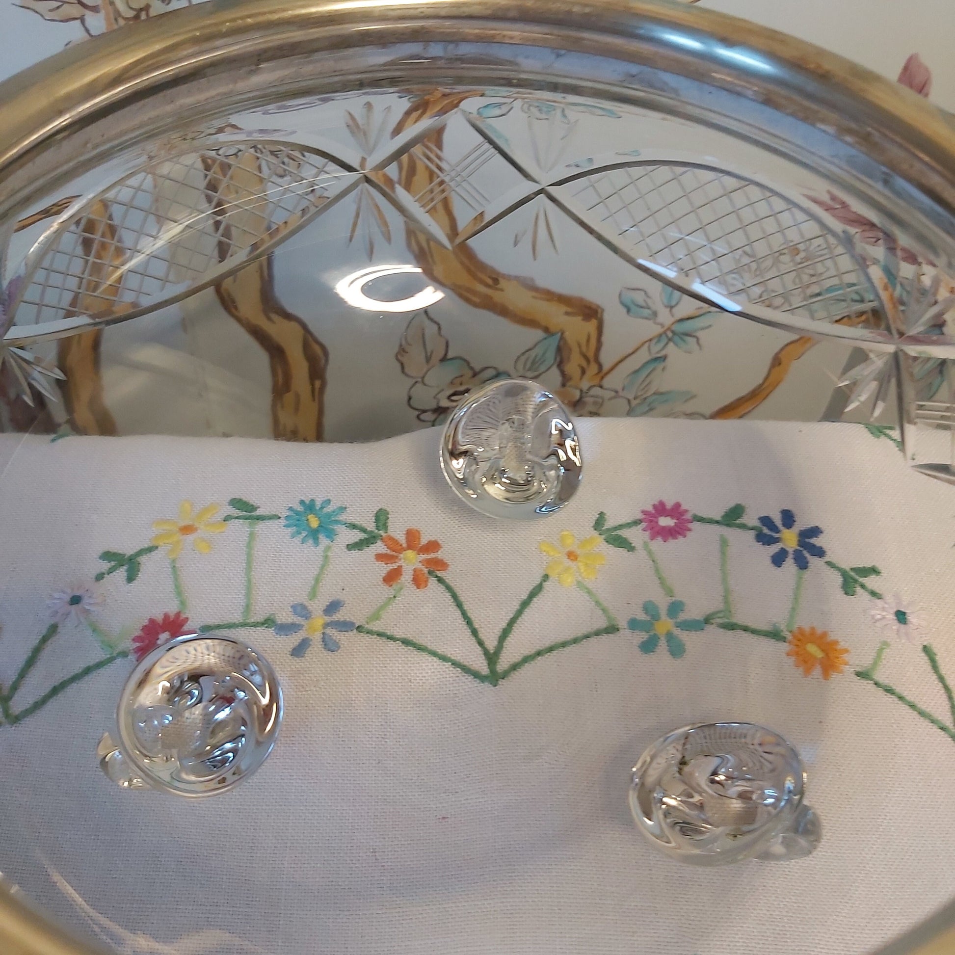 A very elegant cut glass bowl with silver plated mounts and swing handle. The bowl has cut glass designs all around the centre and sits on three glass feet. The bowl is in excellent condition; there is wear to the plate and a dark streak in one of the glass feet which can't easily be seen (please see photos).