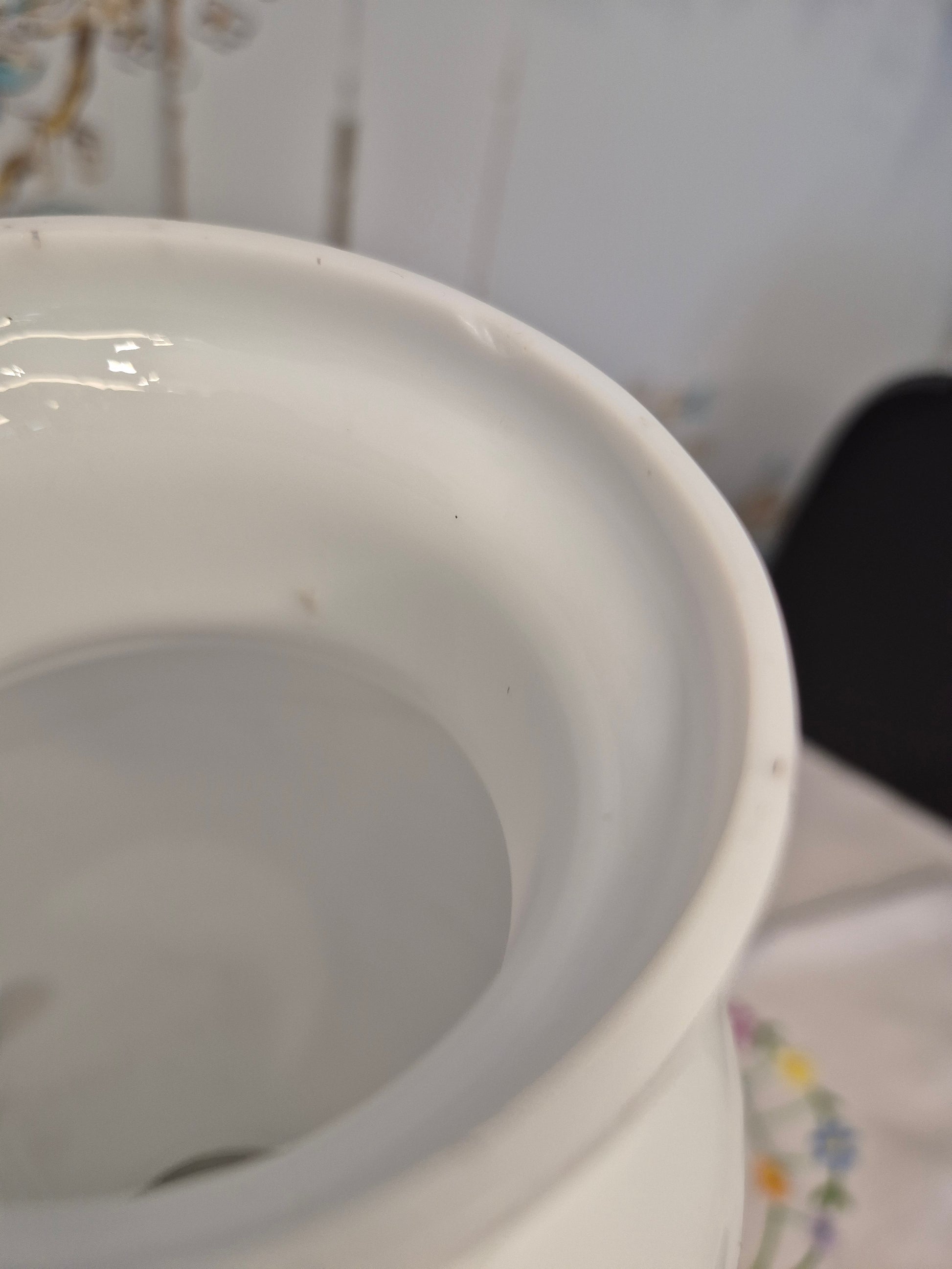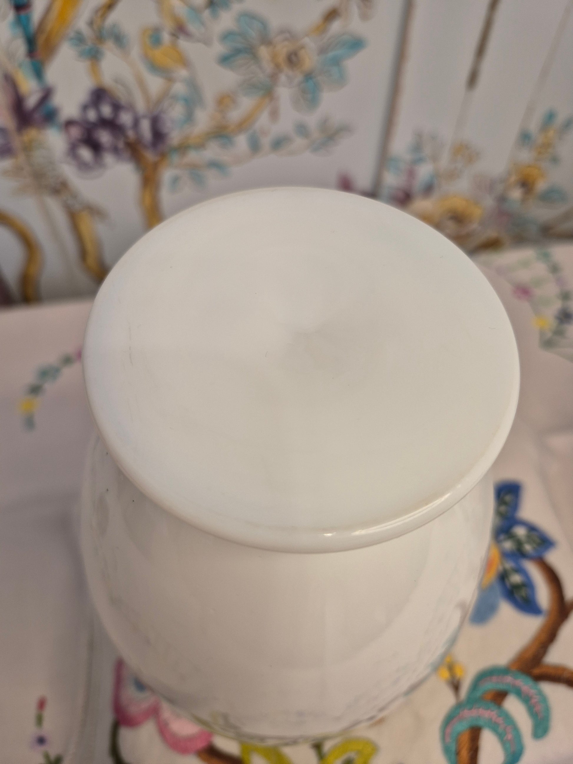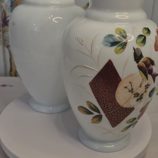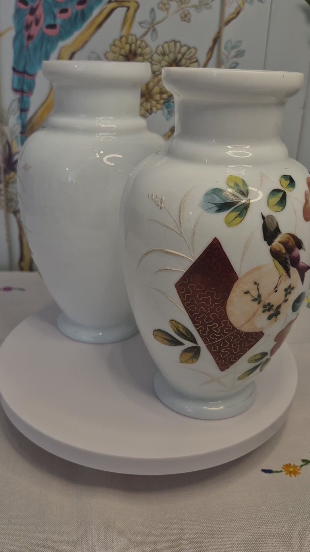 A beautiful pair of milk glass vases from the Aesthetic Movement period, hand painted in the chinoiserie style with birds and blossom. It is unusual to get a true mirrored pair. In excellent condition just with a few tiny nibble around the top edge on each vase.