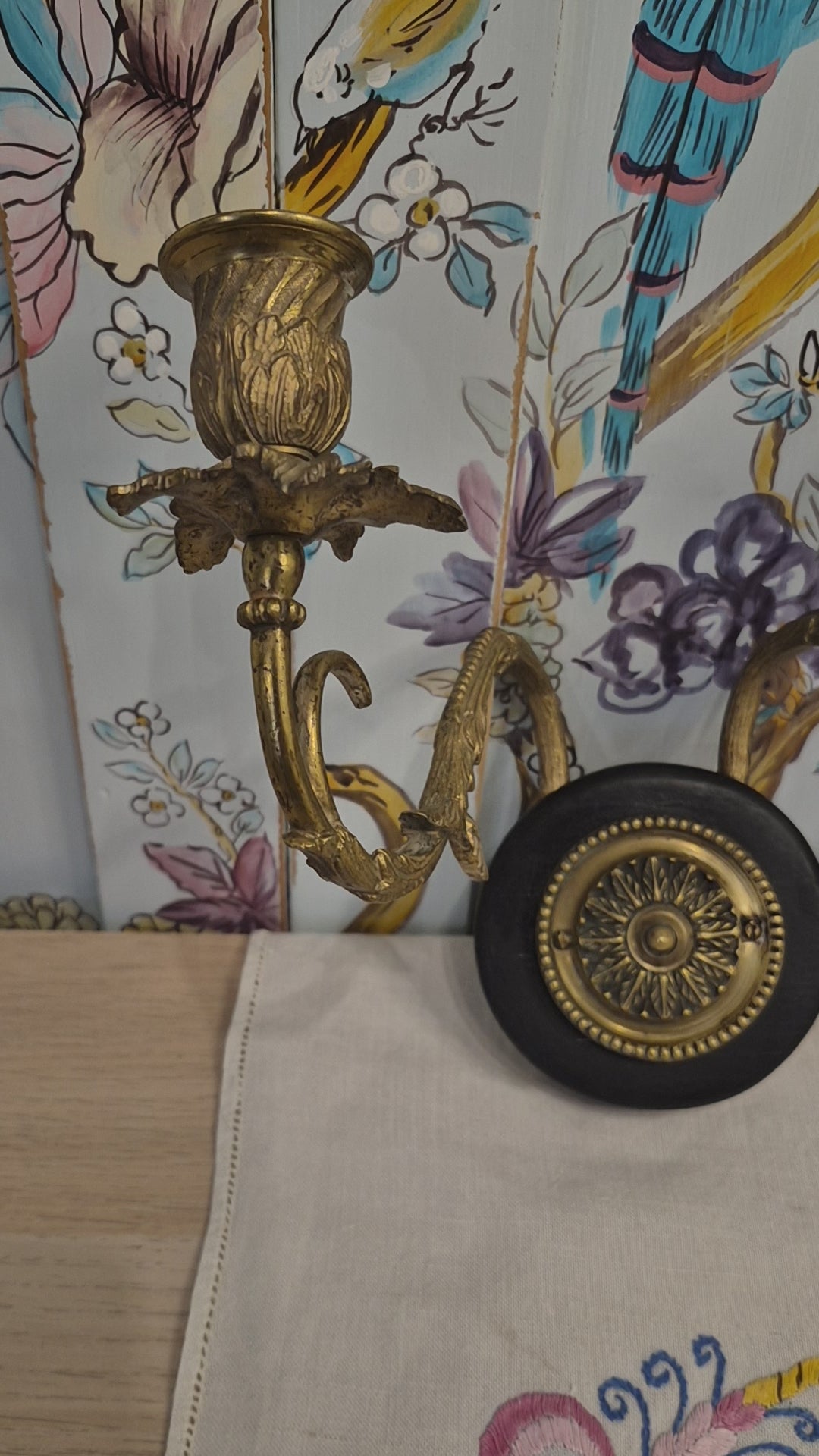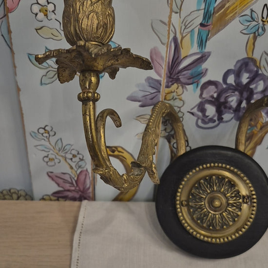 A beautiful pair of antique brass wall sconces c1900. The sconces sit on an ebonised wood roundel with a central floral design, scrolling foliate arms with acanthus leaf drip pan catchers. The central brass panel unscrews for the sconces to be attached to the wall and then the panel is replaced to hide the wall fixing. The sconces are in excellent condition.