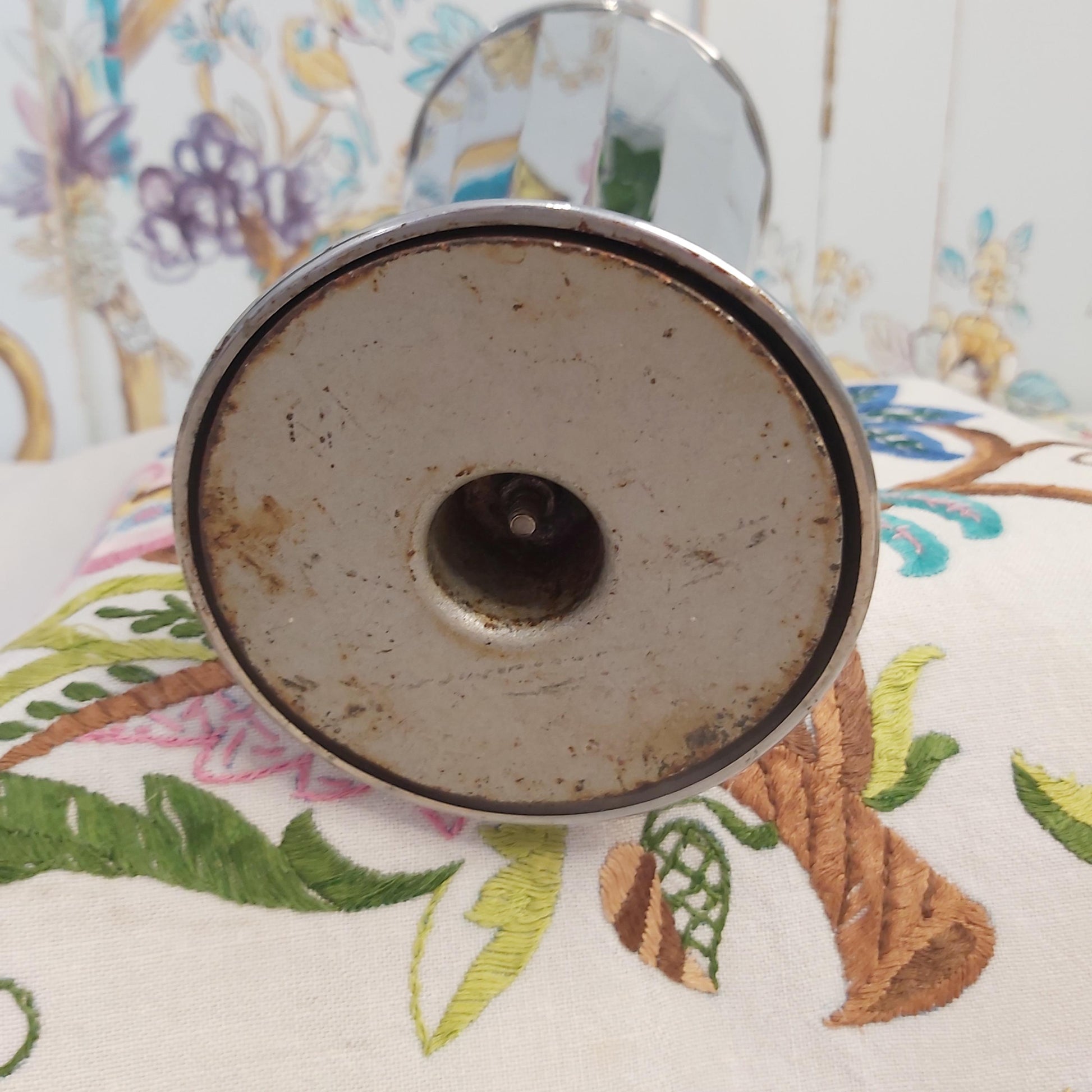 A pair of stunning Art Deco chrome vases with stepped bases and tops and faceted panels around the main body. The vases have weighted bases. They are in excellent condition; slight areas of wear and a couple of small dents which are difficult to see.
