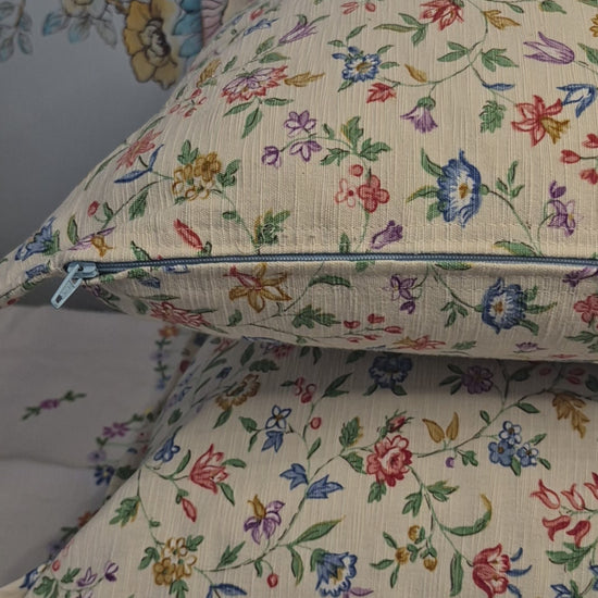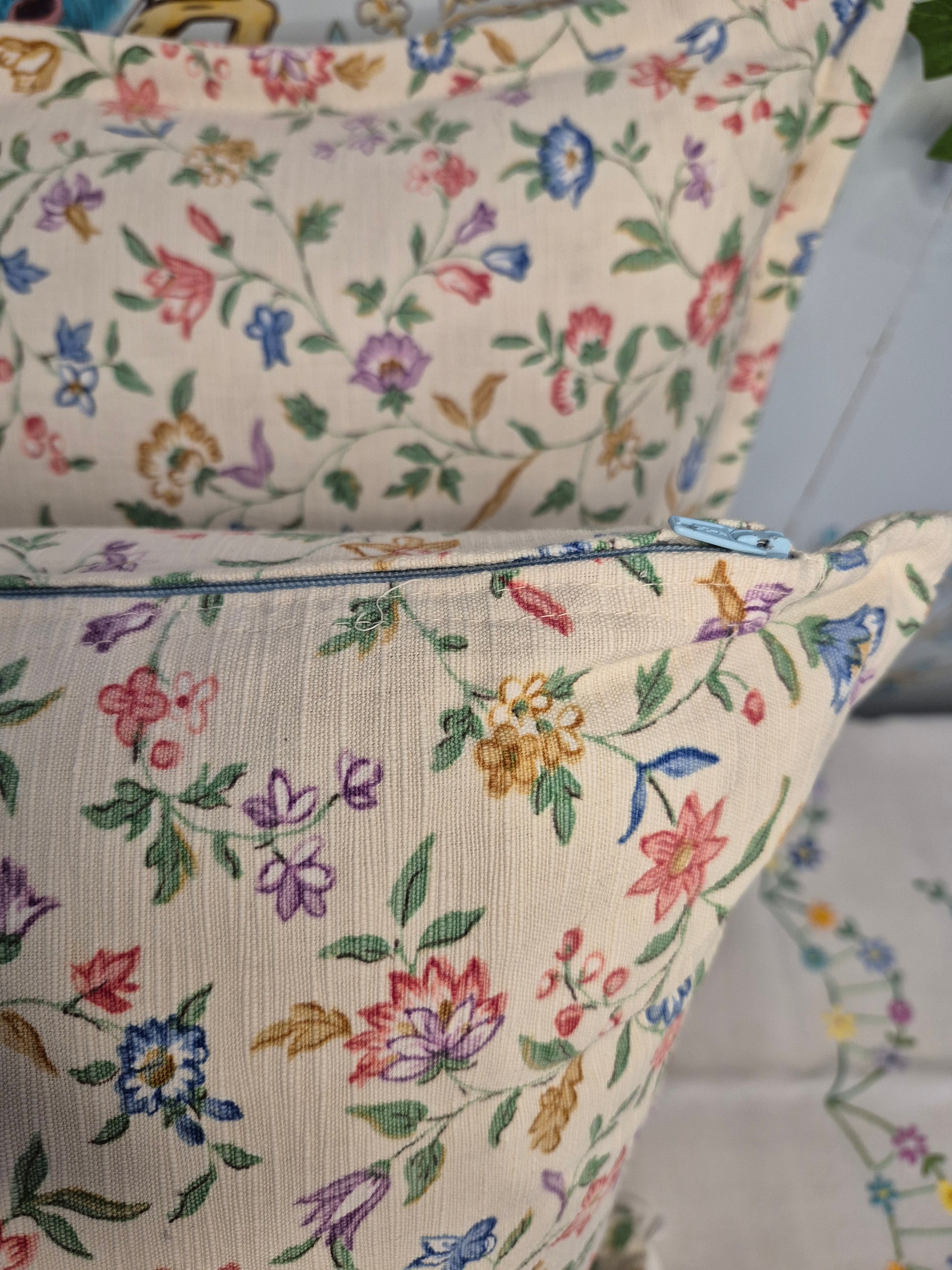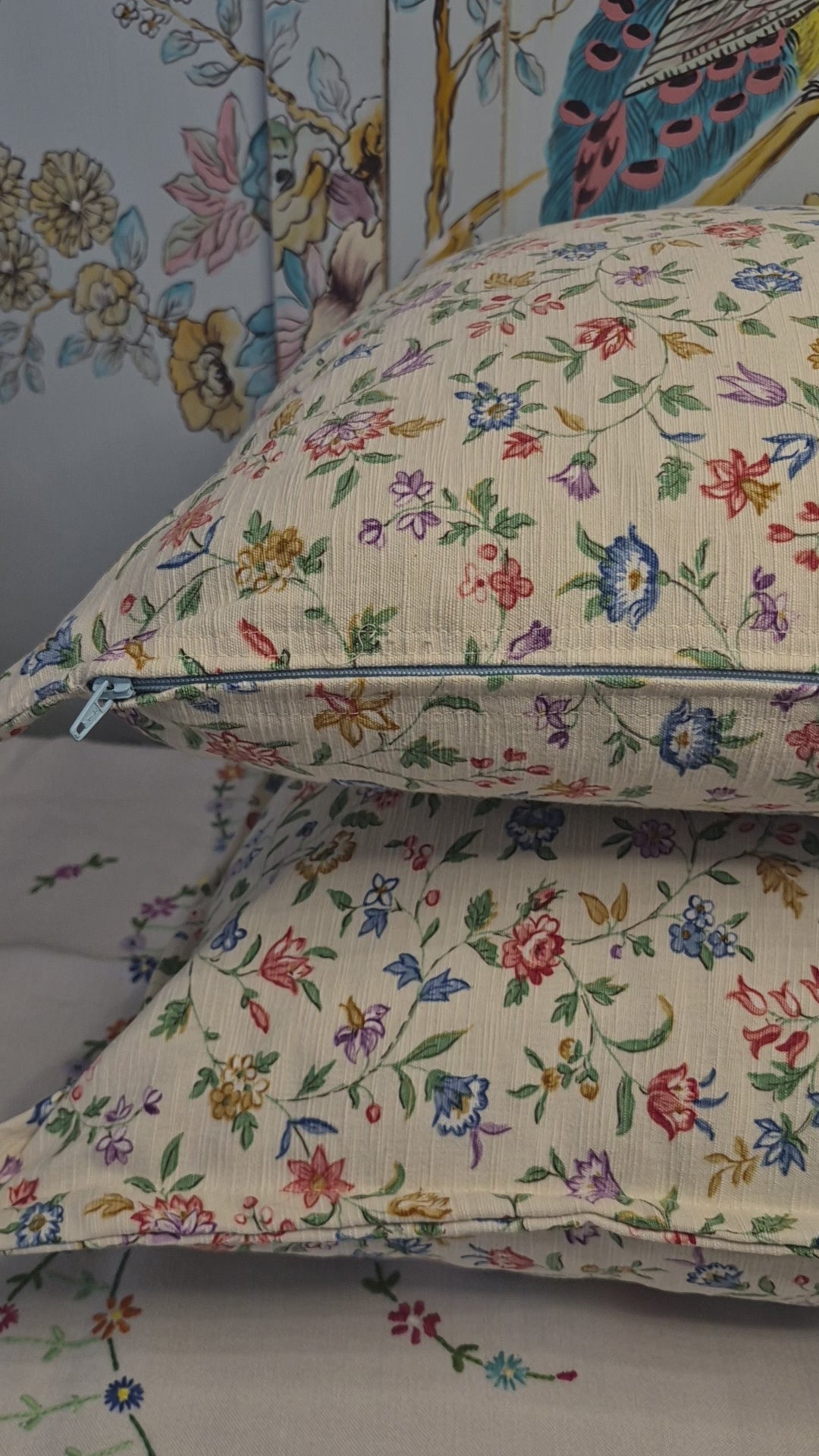 Made by me, a very pretty pair of cushions made from reclaimed vintage floral Sanderson fabric. The cushions have a zip opening and measure 50cms x 50cms.