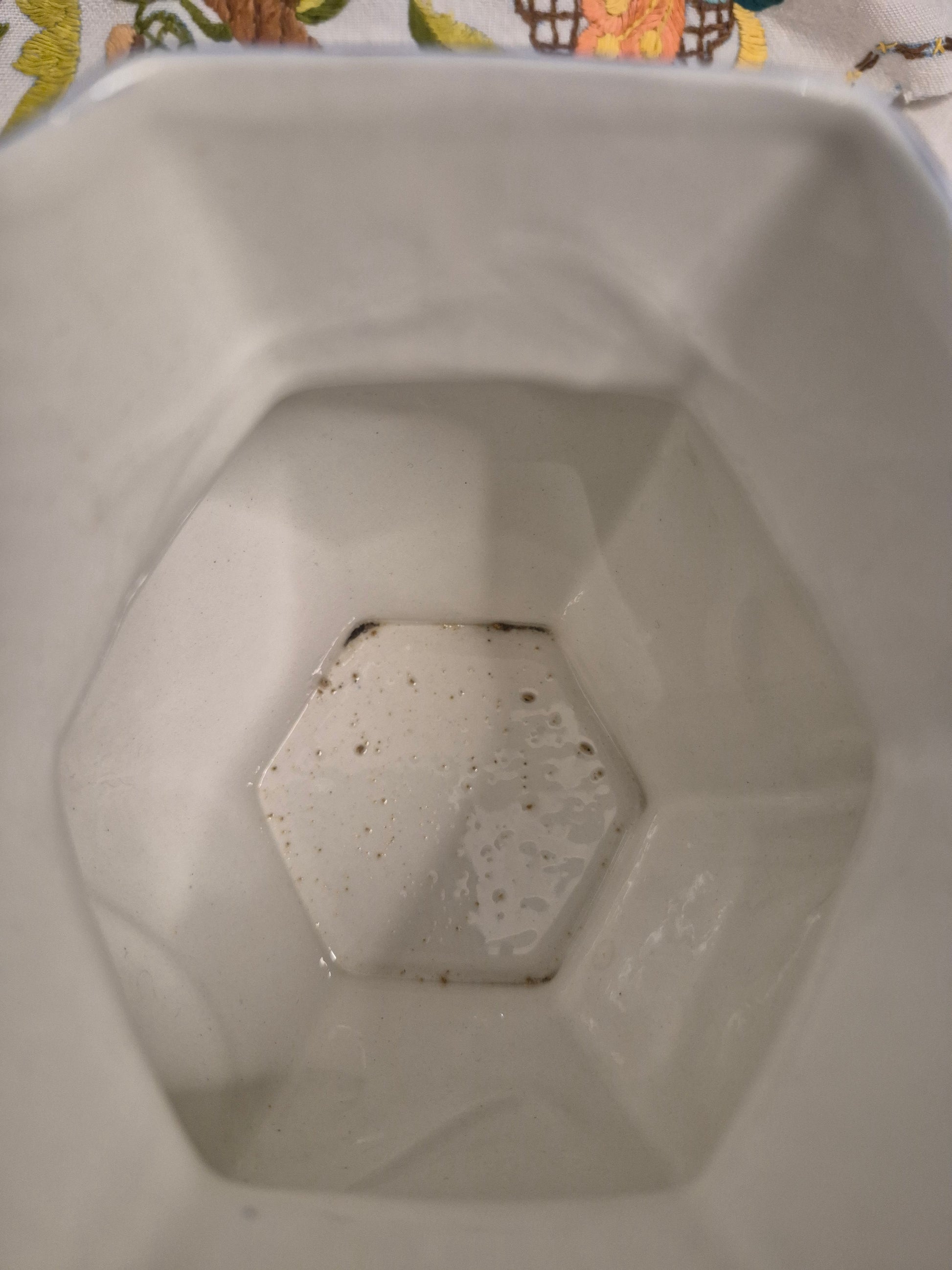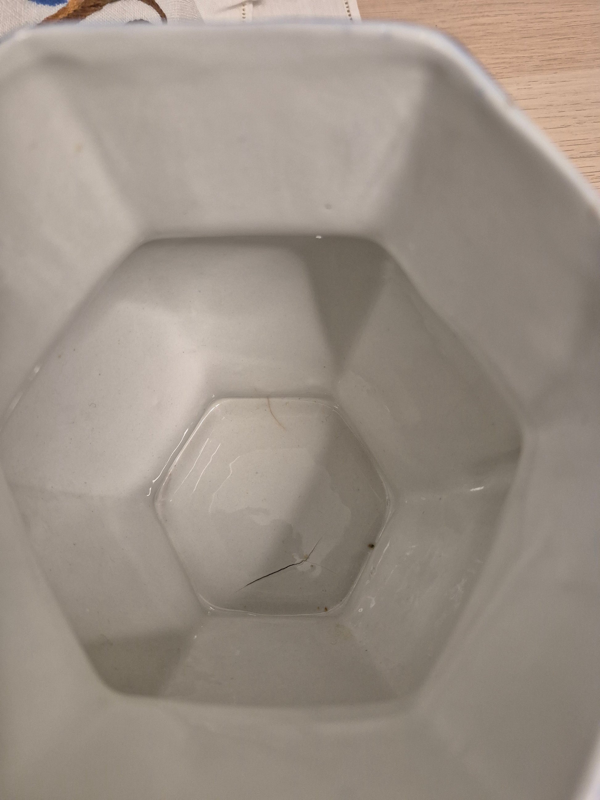They are in very good condition. The larger jug has a small hairline crack and a firing crack in the bottom but is watertight and doesn't leak. The smaller one has dark specks in the bottom which occurred during the firing process. Please see last two photos.