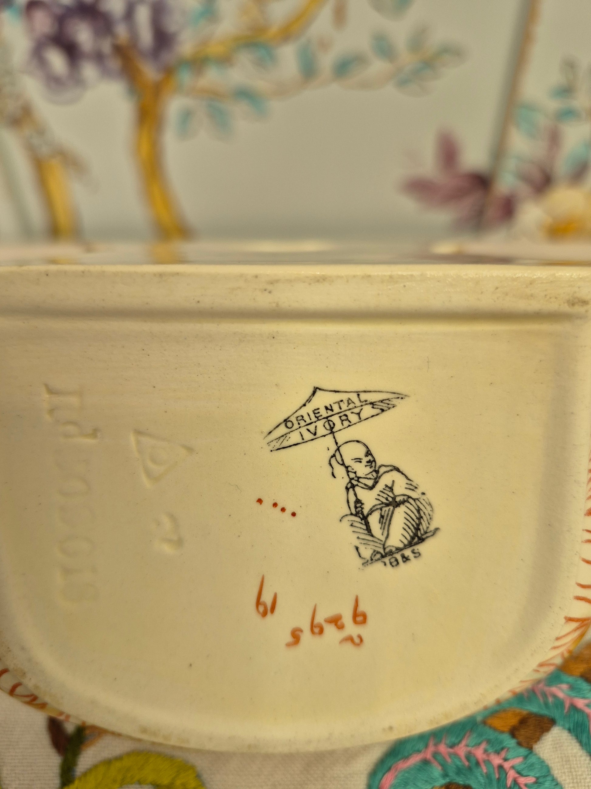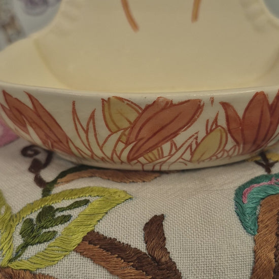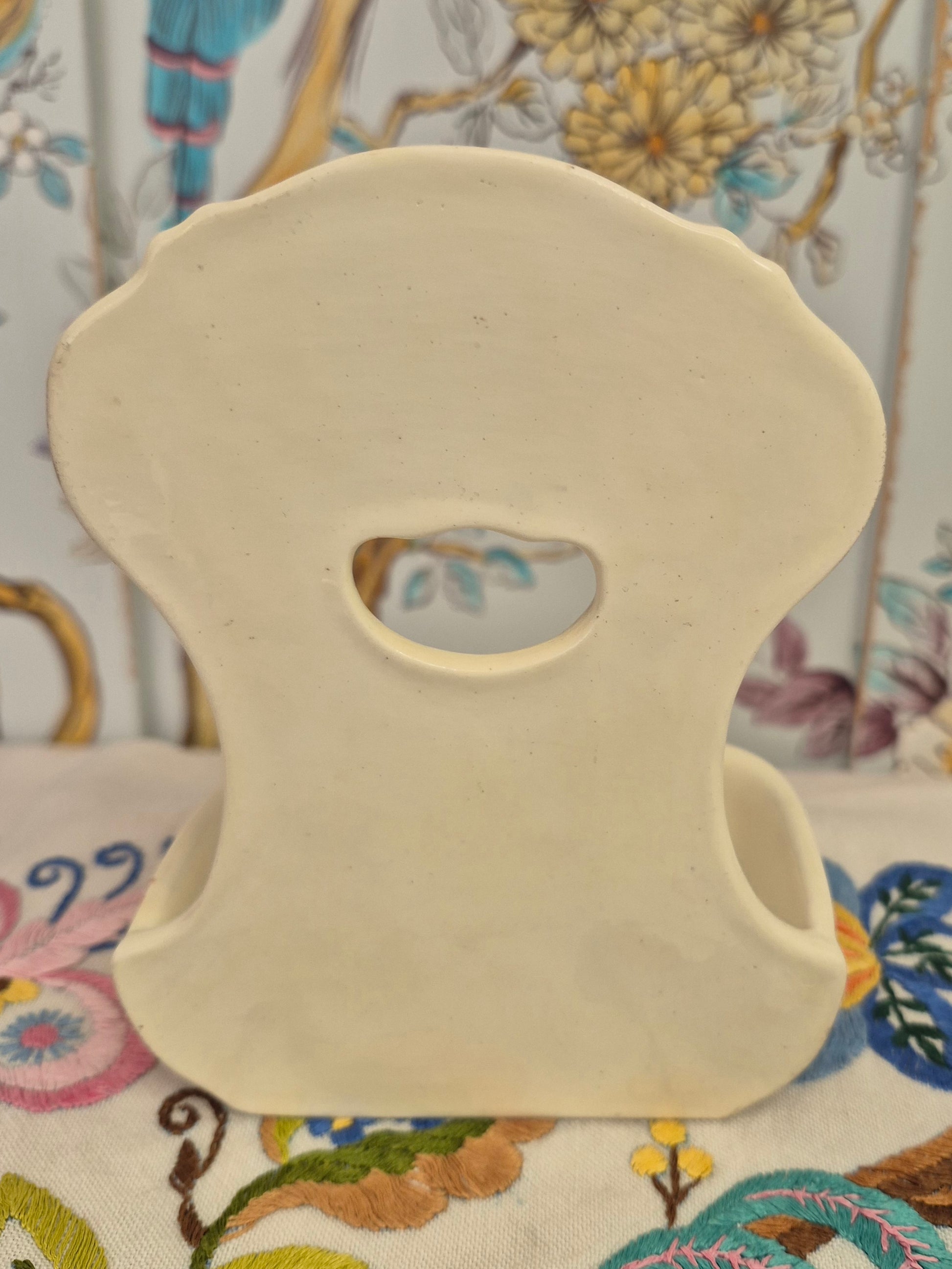 A beautiful and rare antique toothbrush holder from the Victorian period by Powell, Bishop and Stonier. Hand painted in warm yellows and oranges with daffodils and crocuses, it has space for three toothbrushes and a drip tray. The holder is free standing but there is a hole at the back which would allow it to be wall hung. In perfect condition.