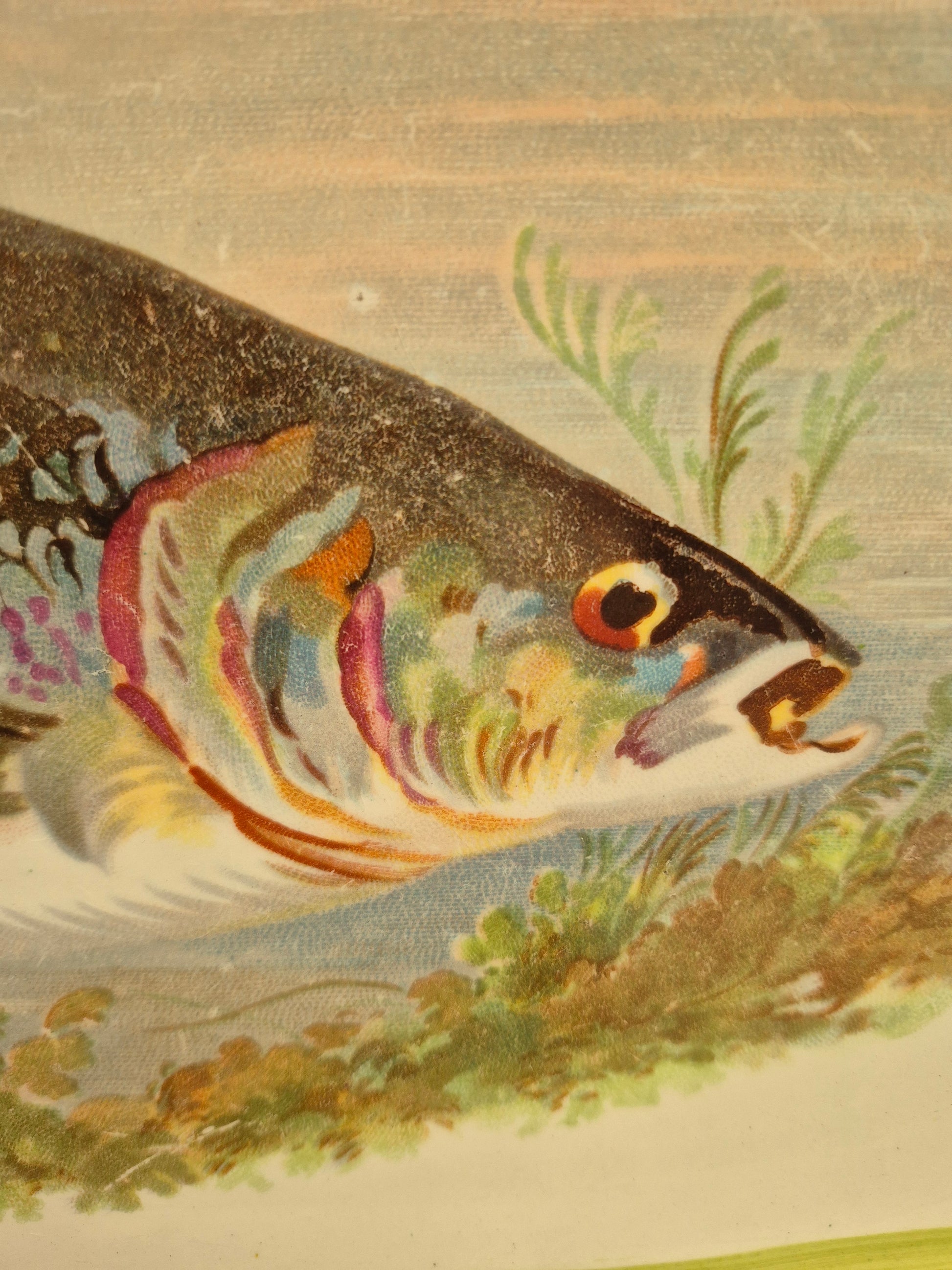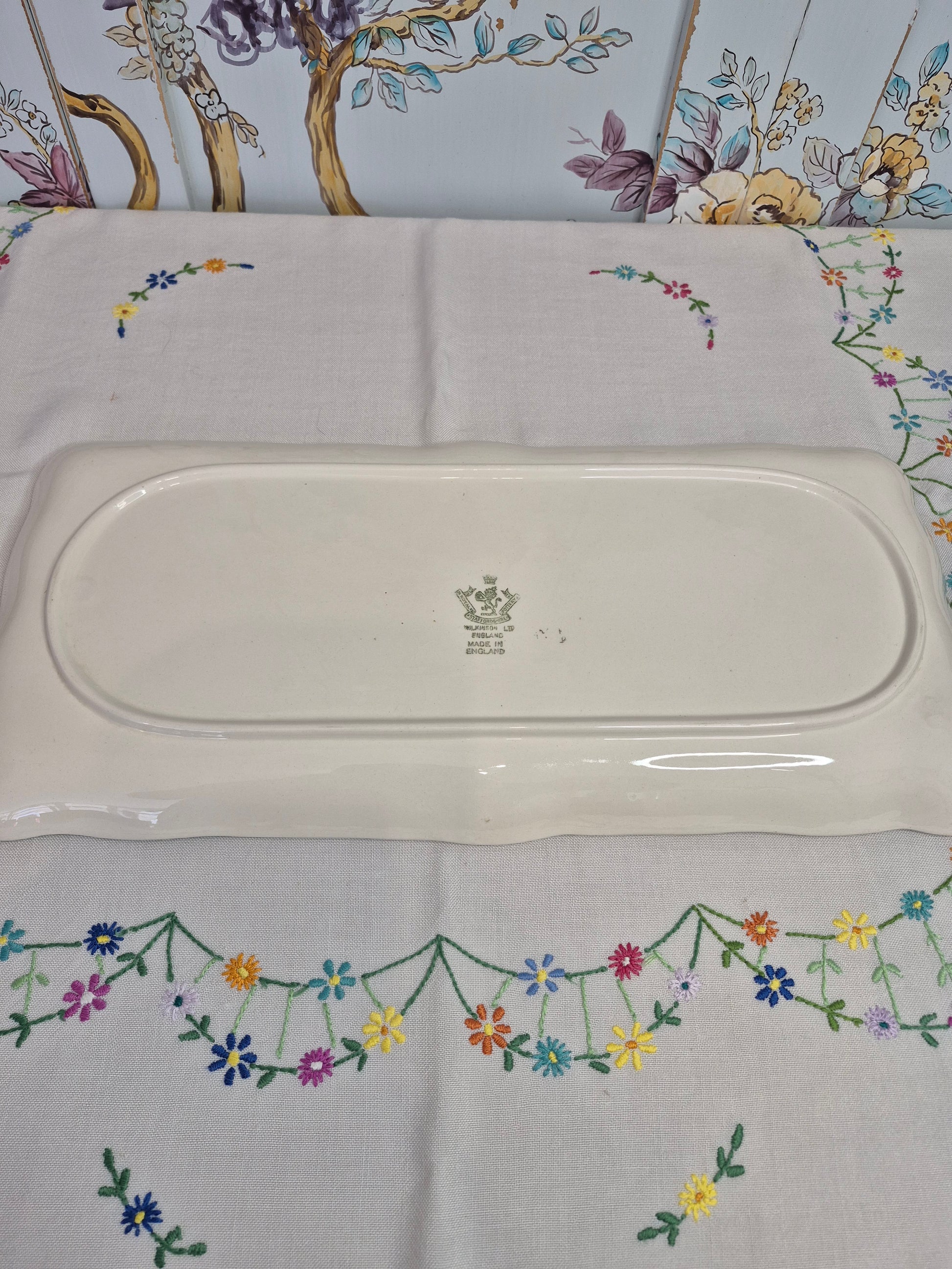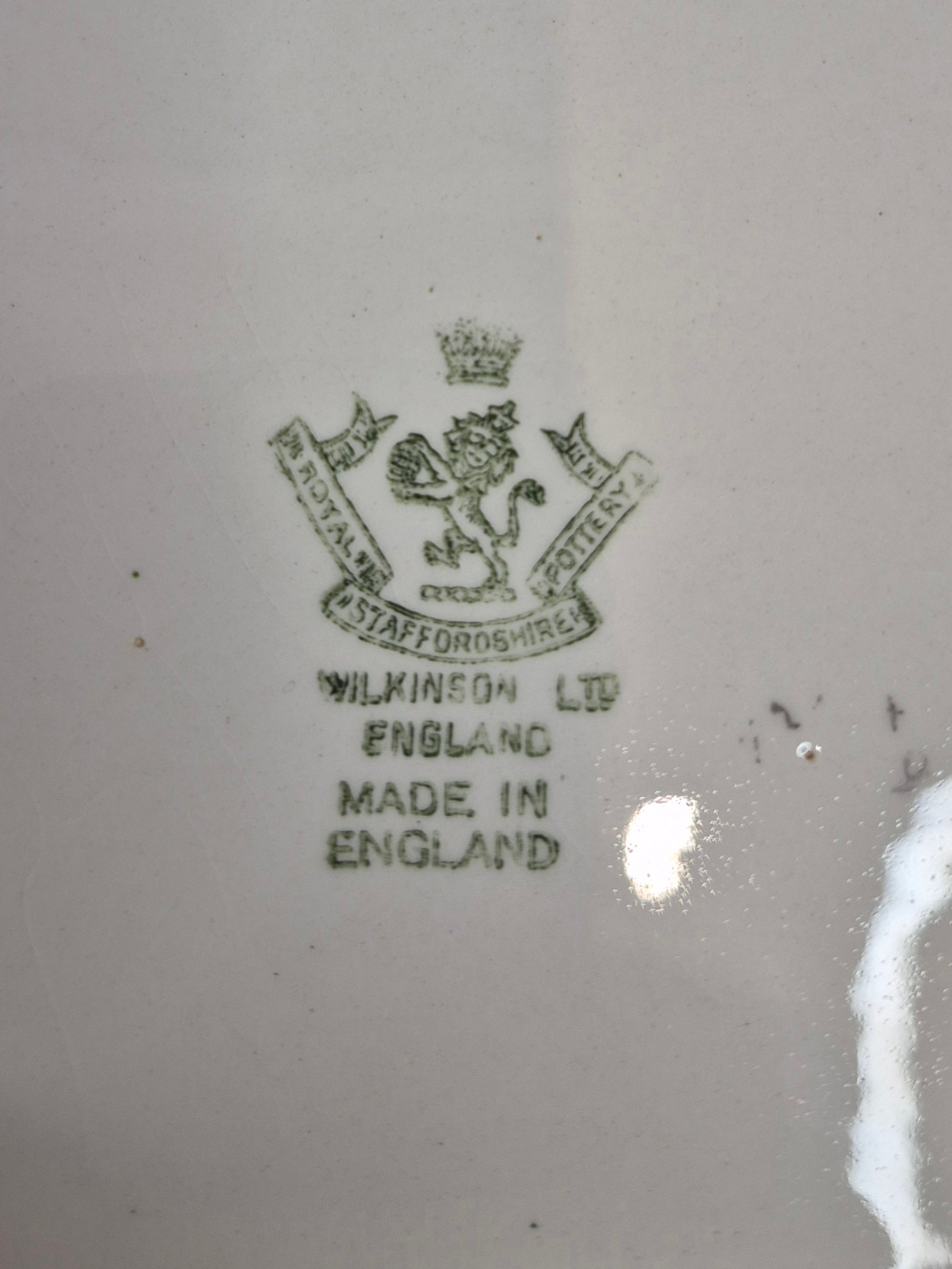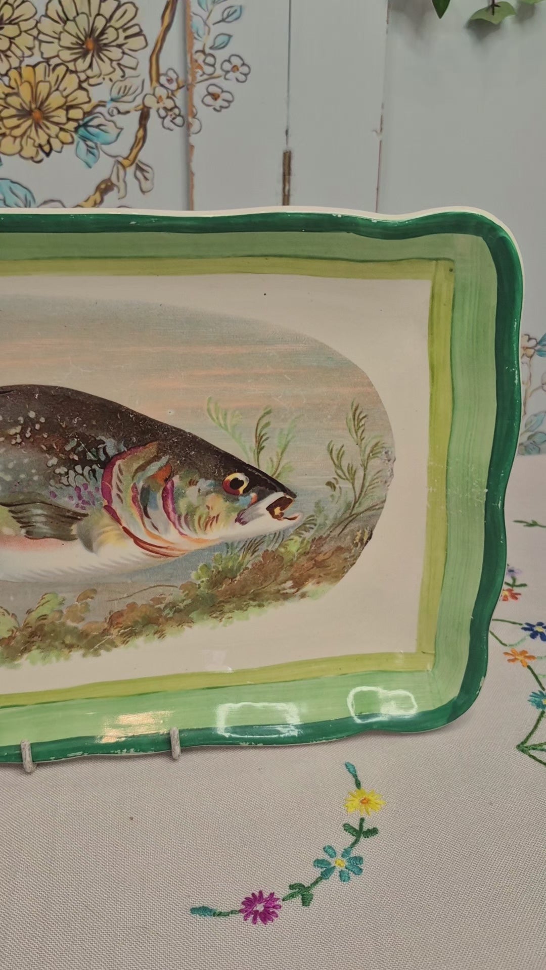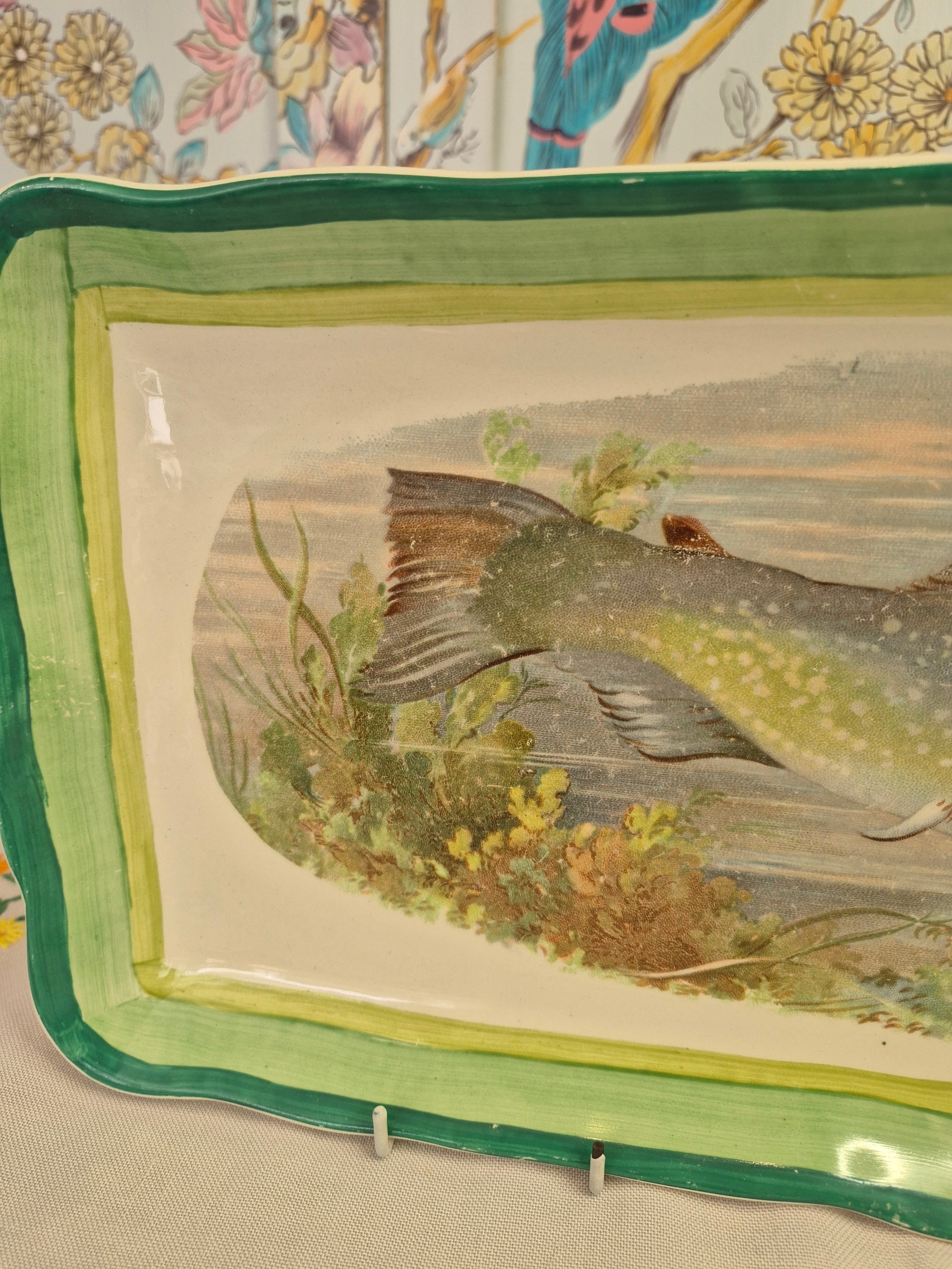 A very nice vintage platter with the image of a trout in the centre and hand painted green bands around the edge, c1930s. On the reverse is the mark for Wilkinsons Ltd, Made in England. The platter is in excellent condition with just some slight rubbing of the hand painted edge (please see photos).