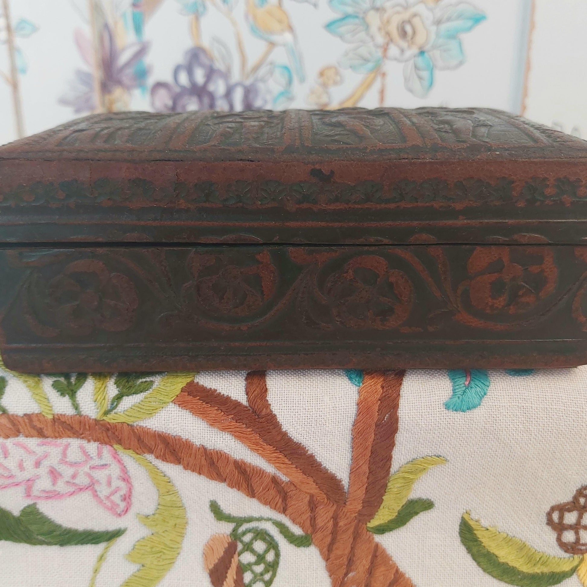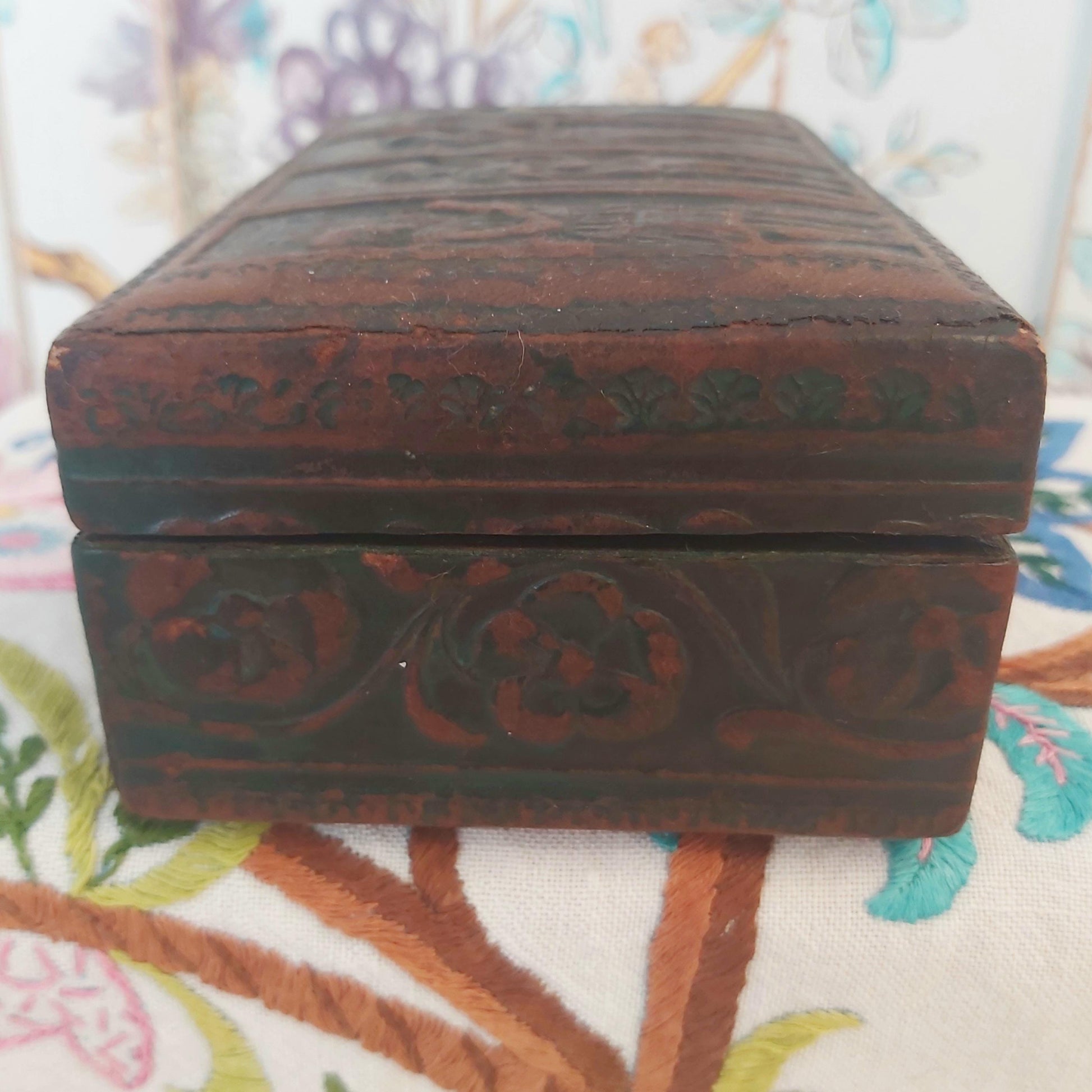 A very good quality vintage leather box embossed on the lid with angels playing instruments and around the sides with flowers and foliage. The leather looks black in the pictures but is actually a very dark green with attractive wear where the original leather colour shows through. The inside is wood lined which may indicate it was originally made as a cigarette box.