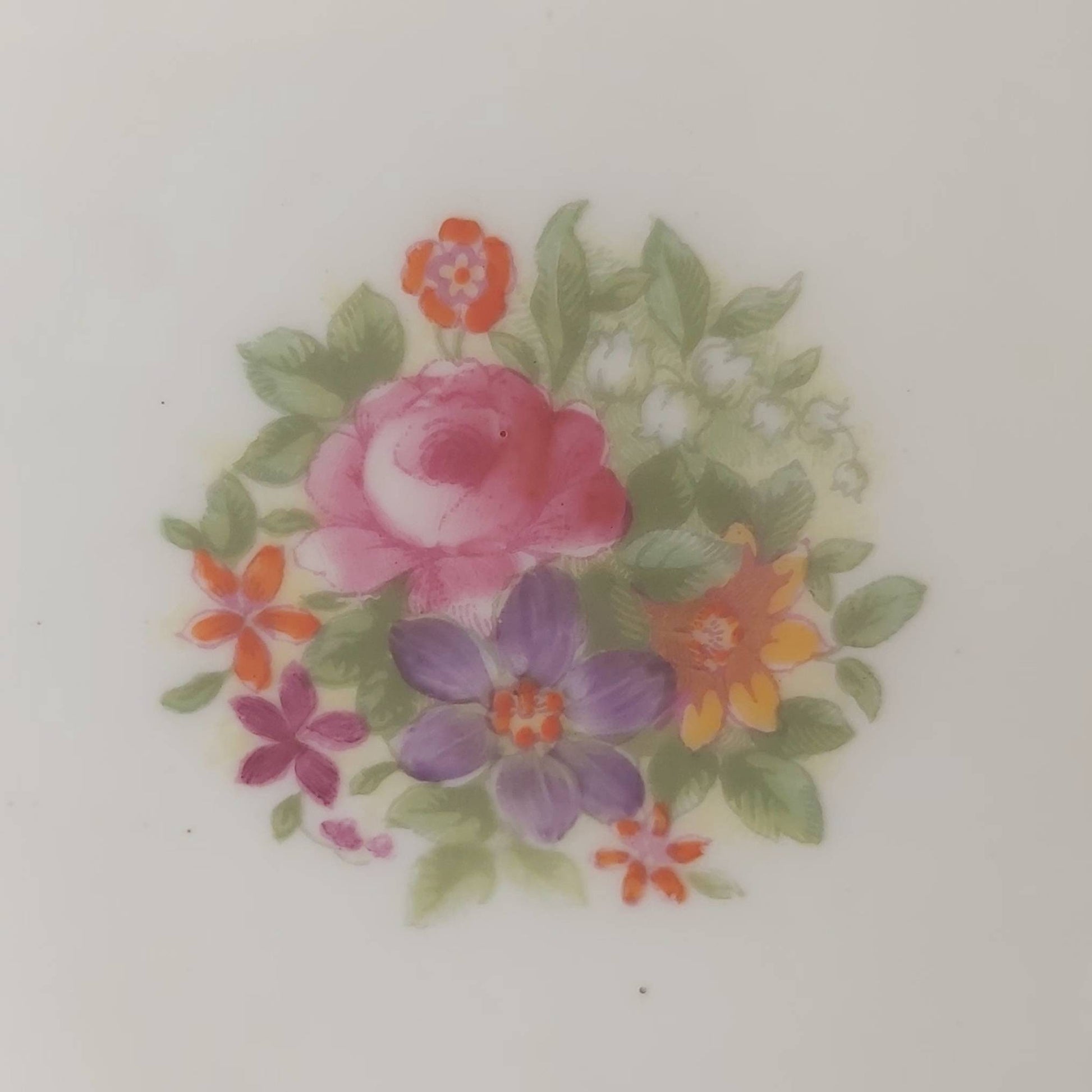 The plate has pretty handpainted flowers in the middle and a wide gilded border with two handles.