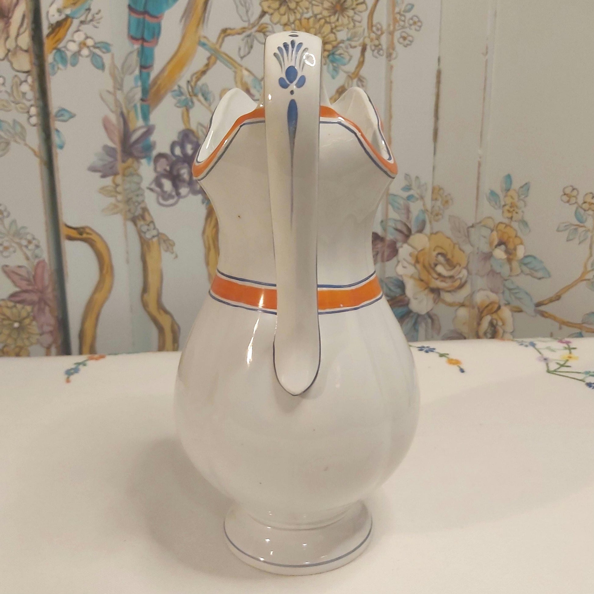 A very nice antique pottery jug by Davenport c1850. The jug has a simple decoration of orange and blue bands on a white background and is in excellent undamaged condition.
