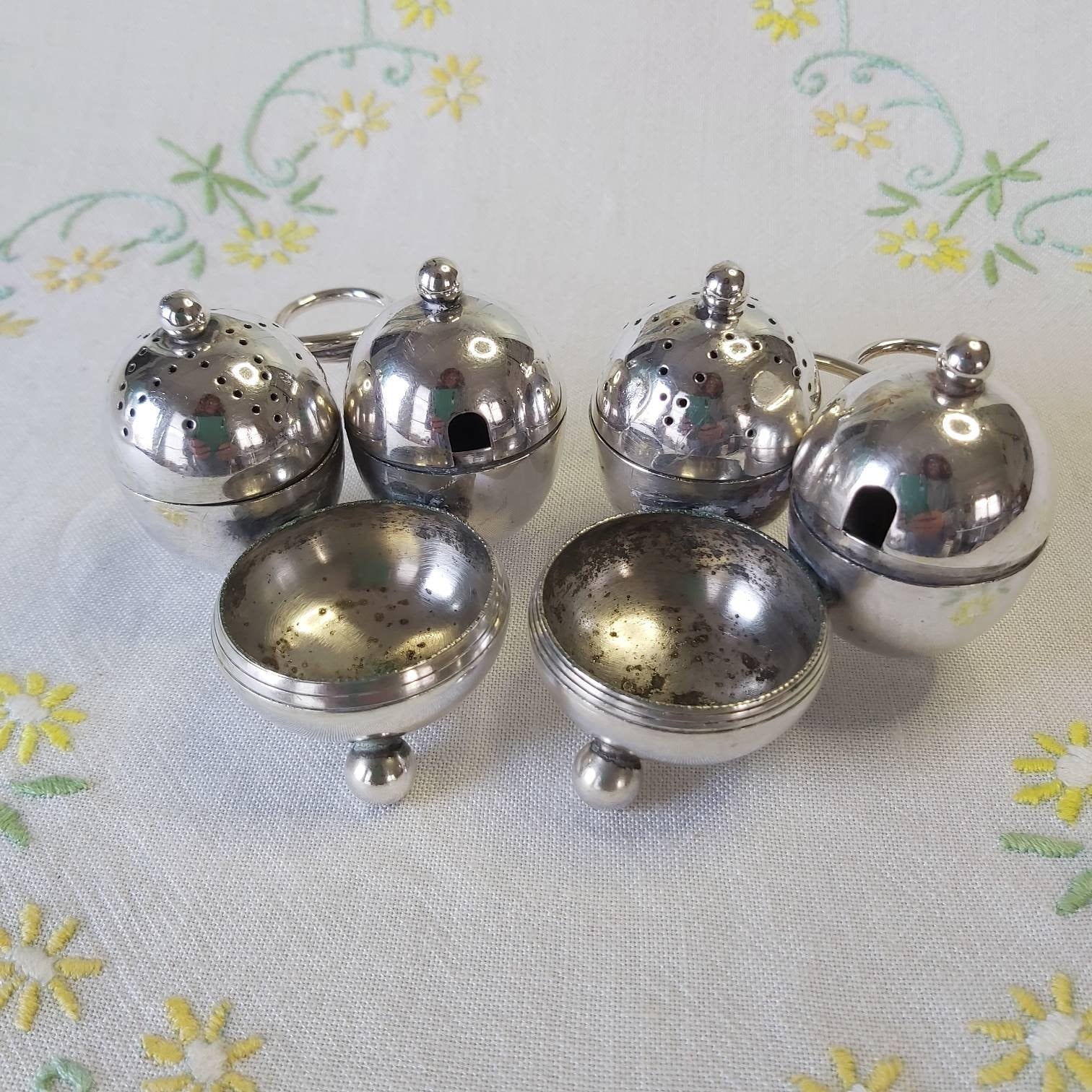 The set is in very good condition but does have damage to the plate from the salt and mustard leaving dark marks in the bottom and a few small minor dents to the bottom of the pepper pot.