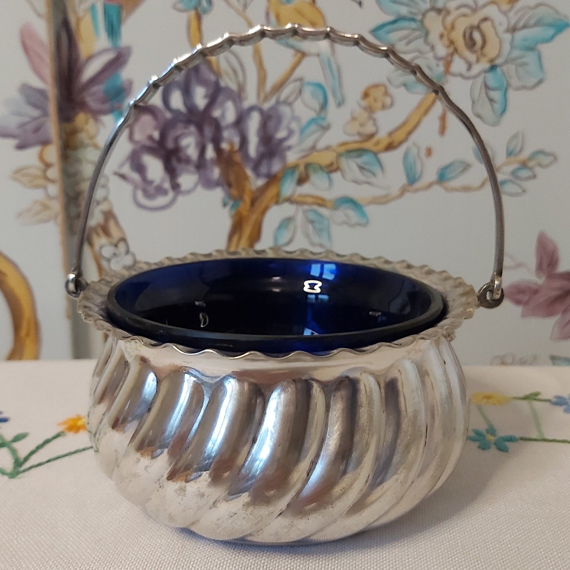 An Antique silver plated sugar bowl with swing handle and blue glass liner made by WMF. The marks on the bottom show WMF with the antler mark which was only used in 1900 and the six petal rosette which was only used on special orders or special issue pieces. The bowl and liner are in perfect condition. I think the blue glass liner is probably original but it is not a snug fit.