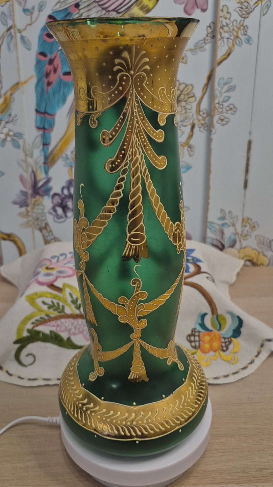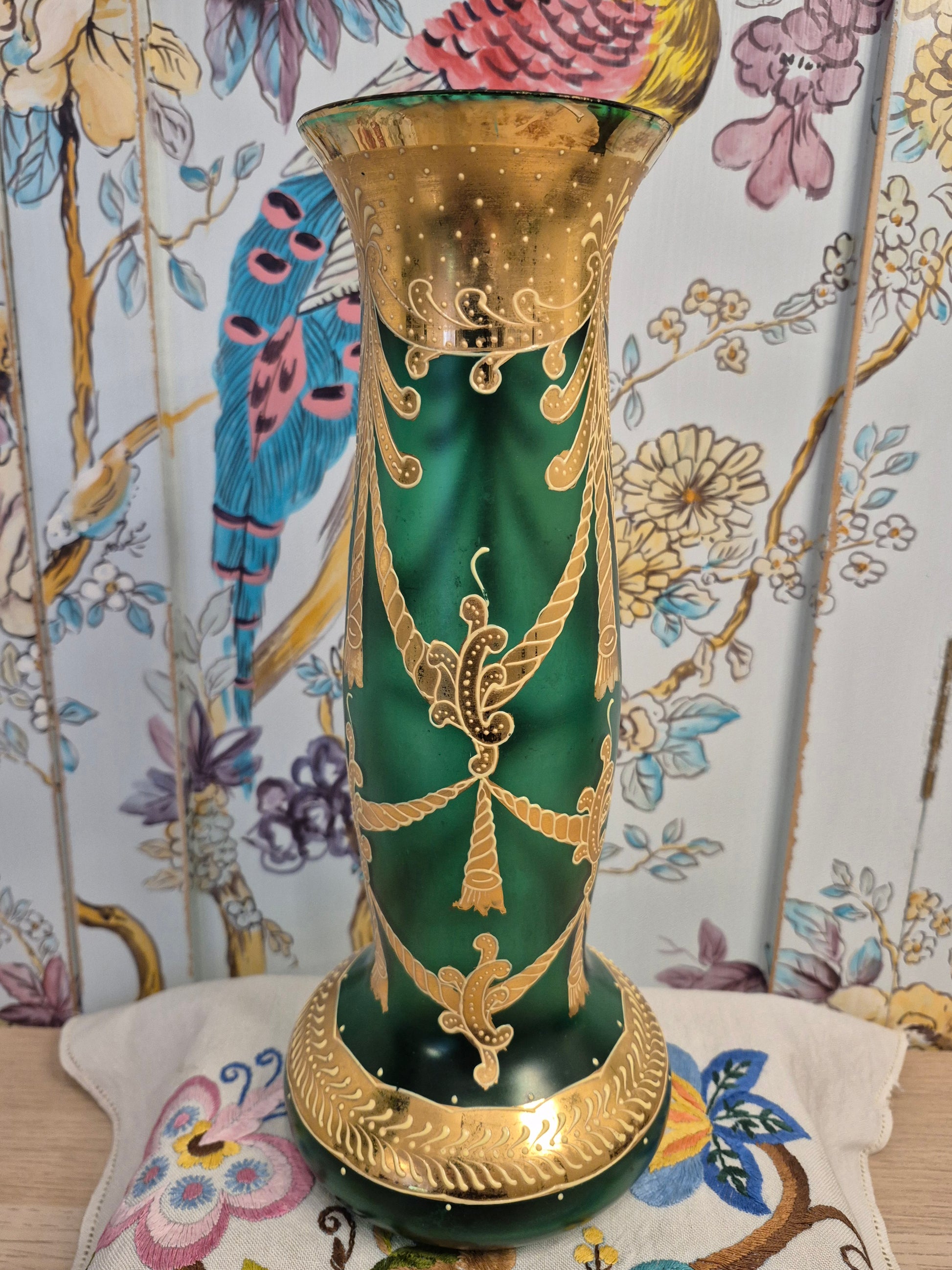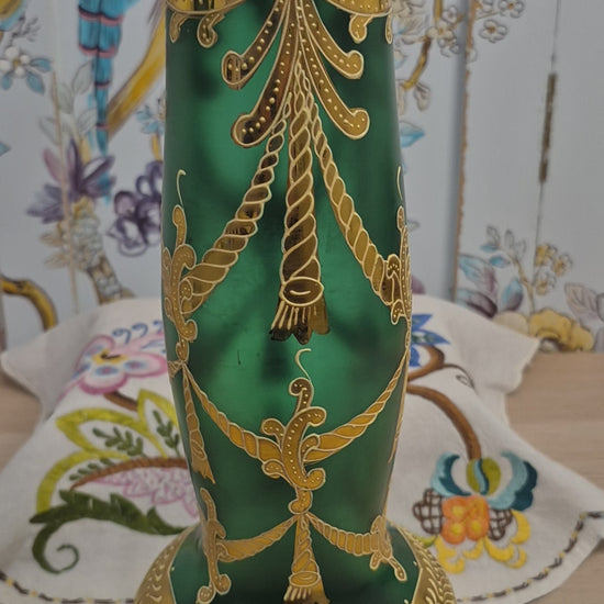 A stunning Art Nouveau green glass vase decorated with heavily gilded and enamel swags. In excellent condition with just some slight rubbing to the gilding around the top edge (see last photo).