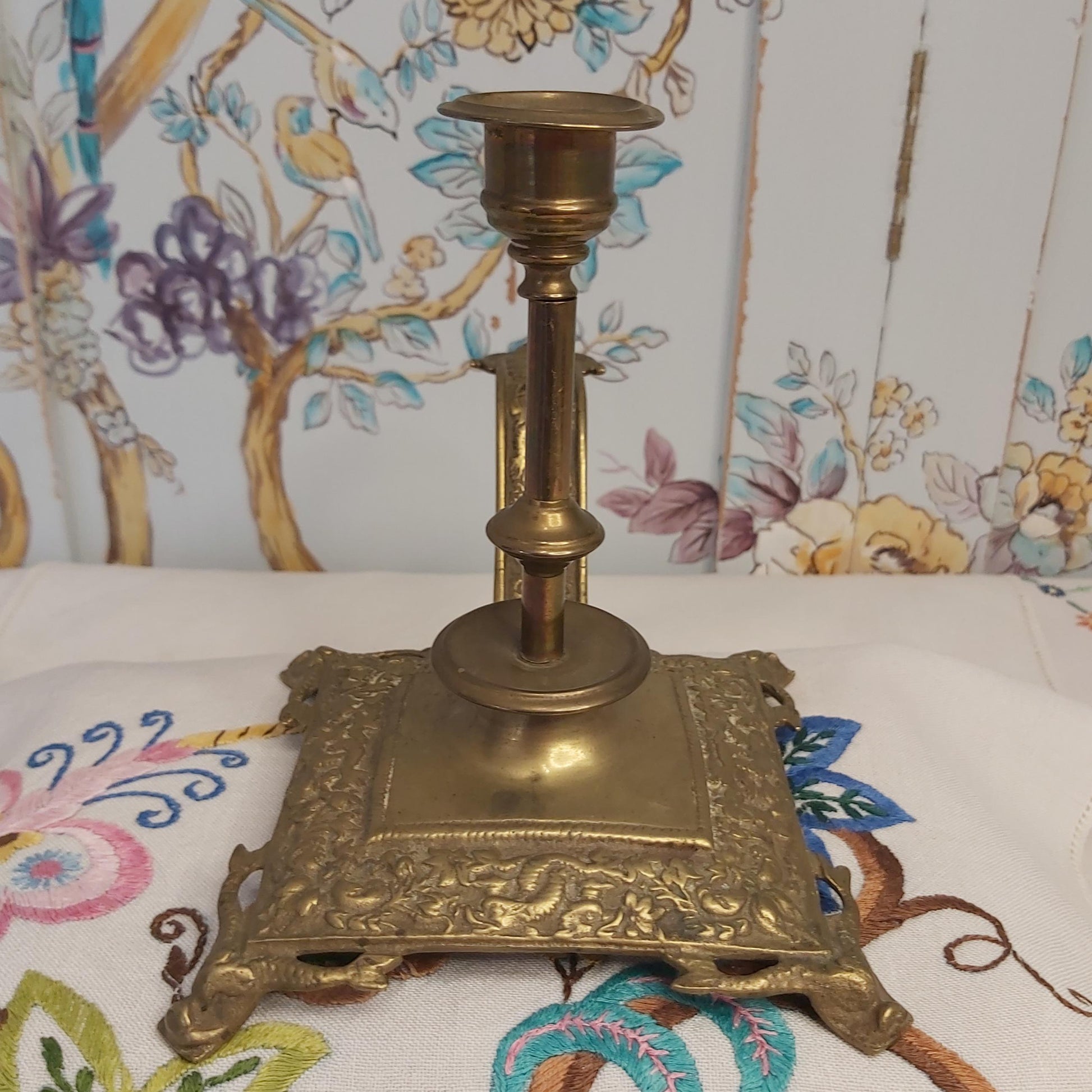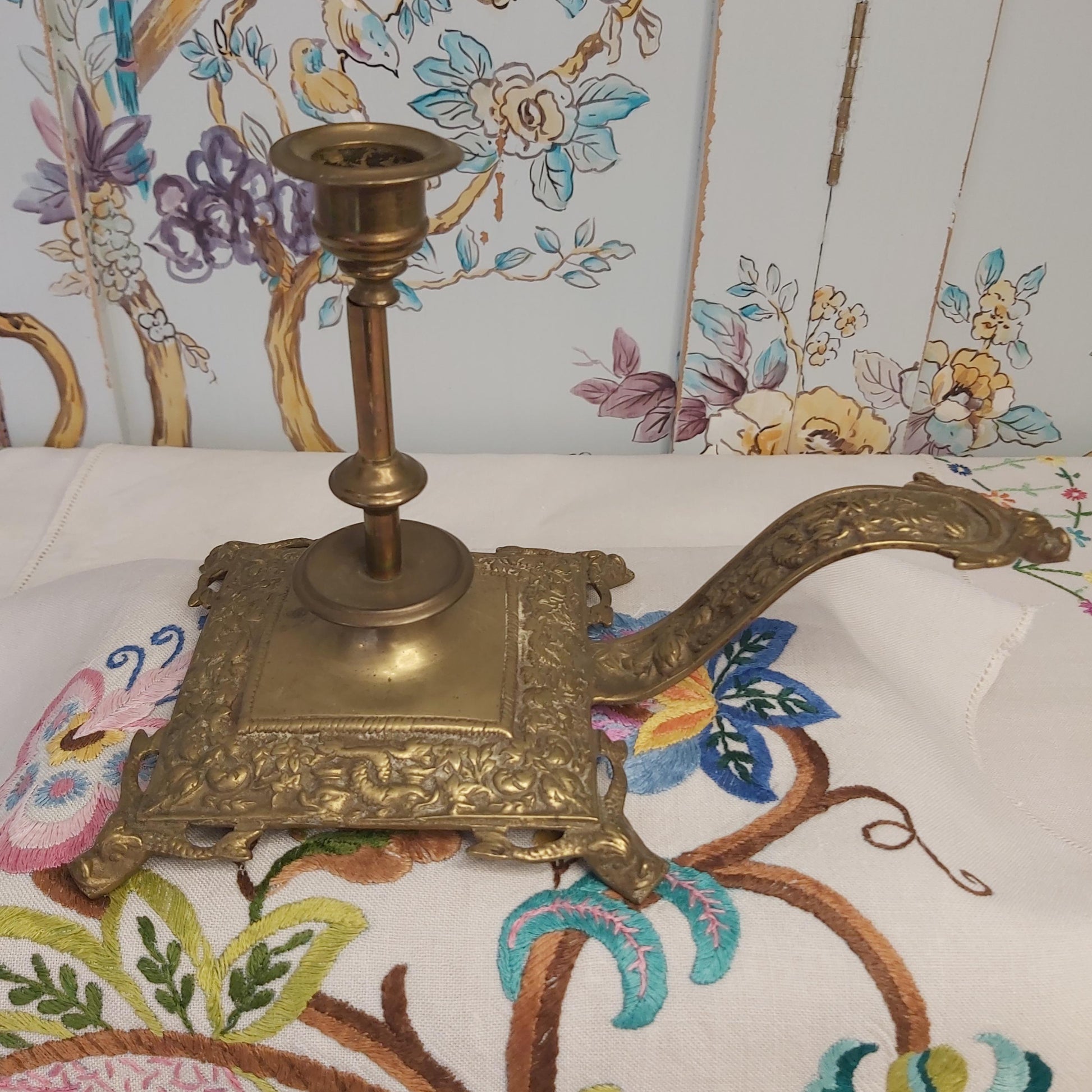 A beautiful quality antique brass or possibly ormolu chamberstick in a square shape with carrying handle. The chamberstick features four feet in the shape of mythical dolphins. Around the sides and the handle are also decorated with dolphins, scrolls and foliage. Underneath the handle are some worn marks which I think say 'HB'.