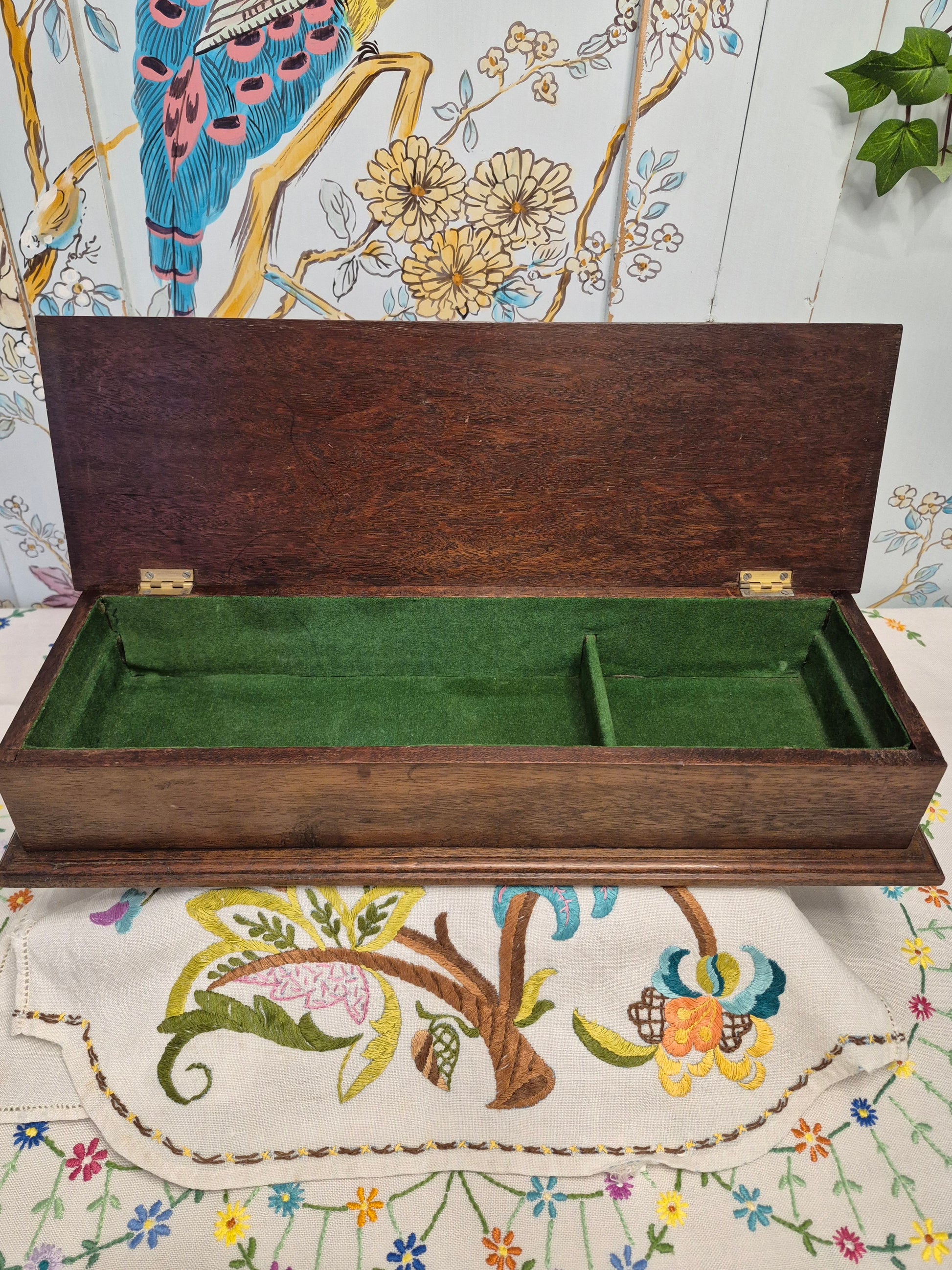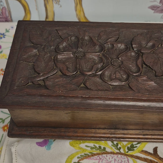 A beautiful antique long wooden box with wild roses carved into the hinged lid. Inside the box has two compartments and is lined with green felt. The box is in excellent condition although the green felt is complete but a little tired. I think the box dates to C1900-1910.