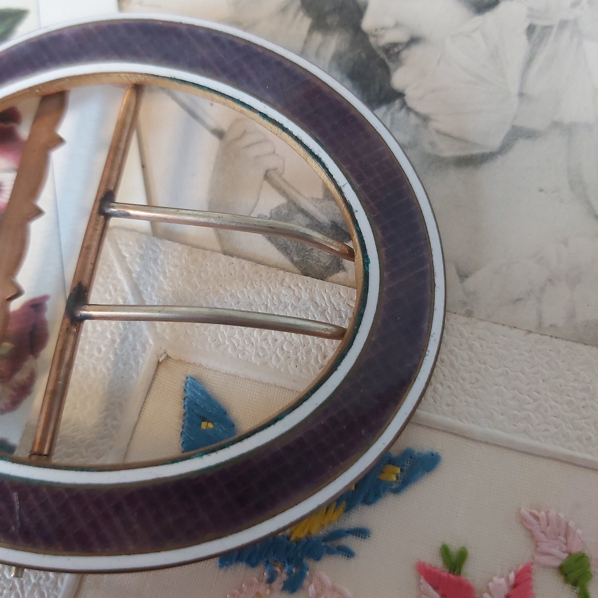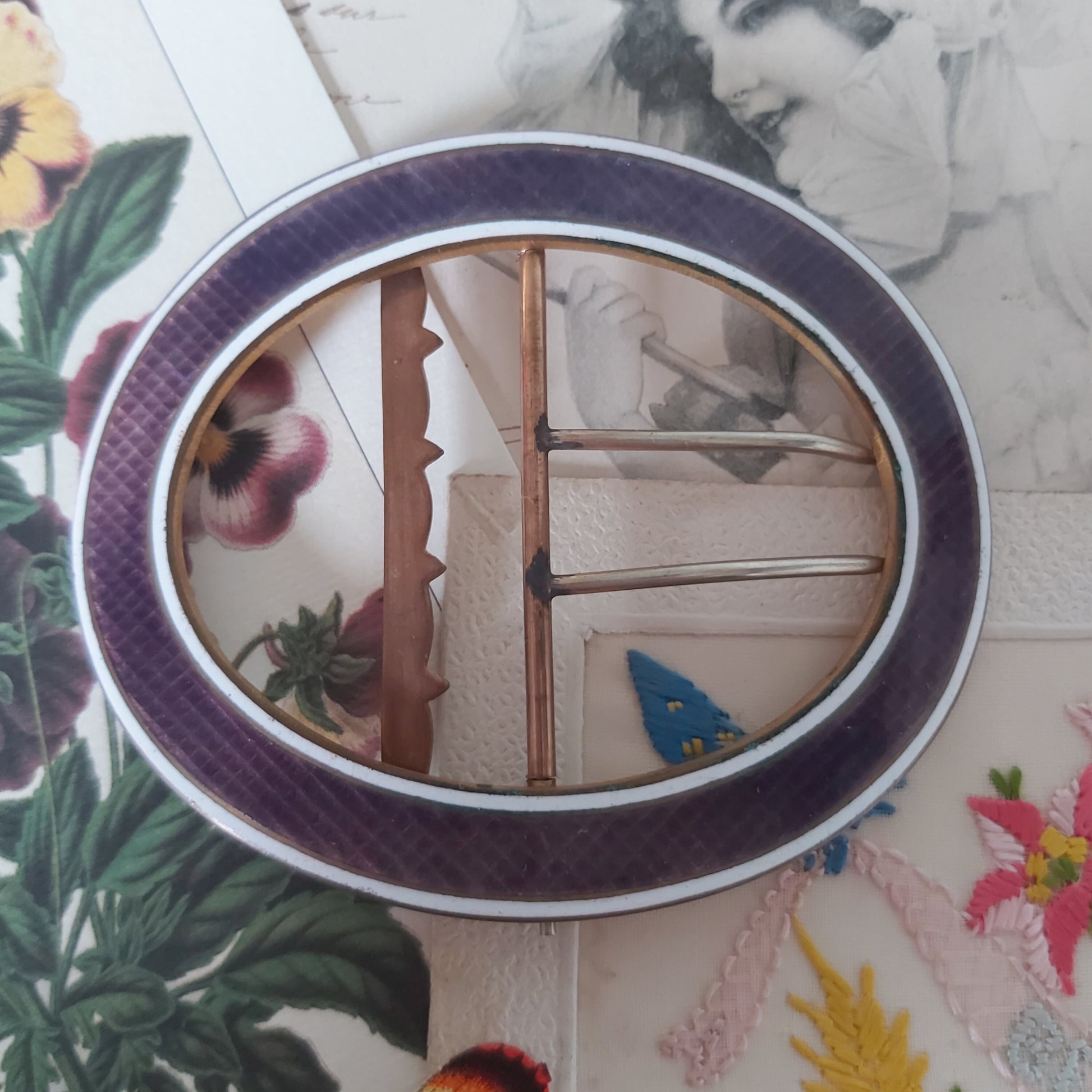 A beautiful antique buckle in a purple guilloche enamel with white enamelled edge on gilt metal. This buckle may have been worn on a green silk belt in support of the Suffragette movement whose colours were green, white and violet (Give Women Votes).