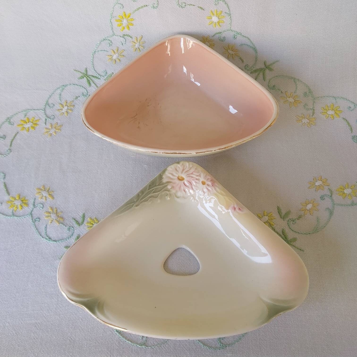 A beautiful antique French wash set comprising of three pieces; a sponge bowl, soap dish and tooth brush tray. In pastle tones of greens, blush pinks and apricots, decorated with flowers. There are some remains of the gilt edging.