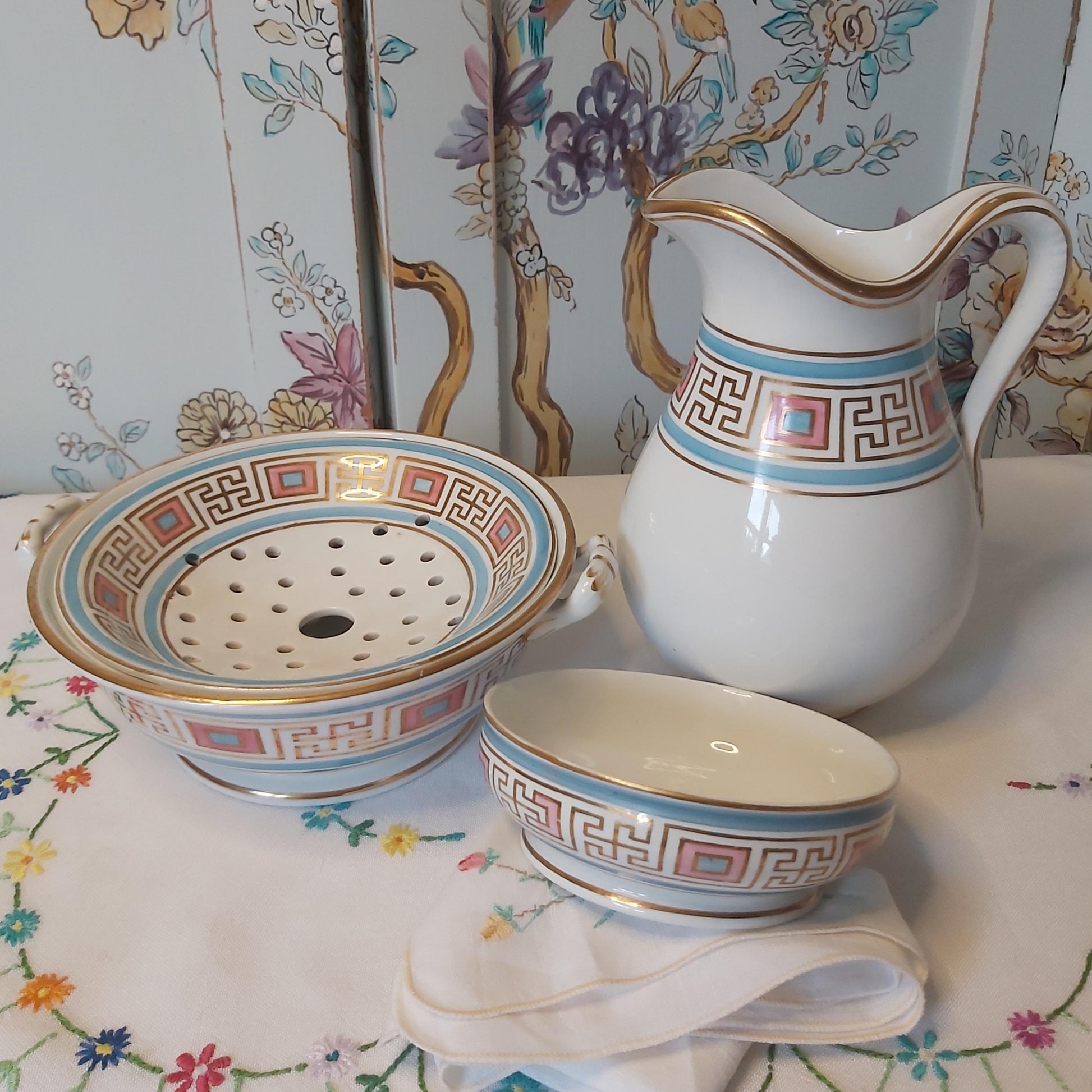 A stunning antique Minton Jug which is part of a wash set. The jug is decorated with a handpainted turquoise, pink and gold Greek key pattern. The other parts of the set have the impressed Minton mark but the jug is unmarked.