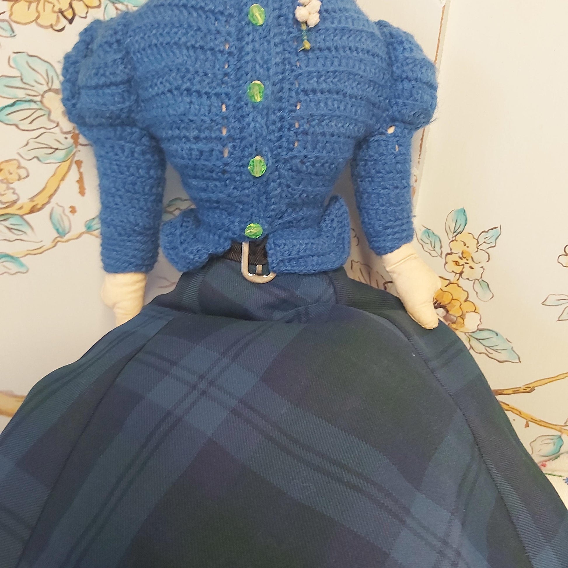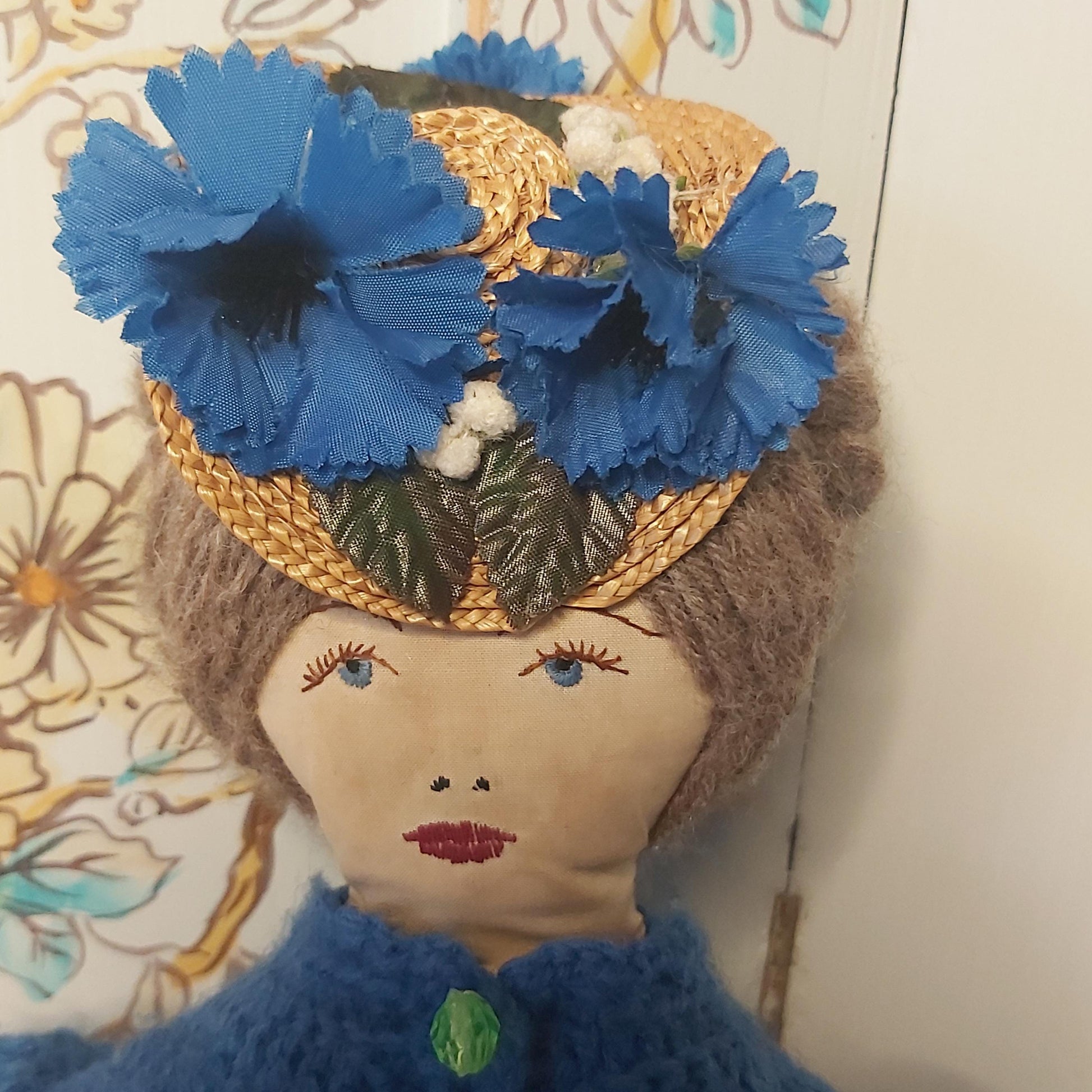 A beautifully handmade antique rag doll of an Edwardian Lady, made from a fine cotton with a delicately embroidered face. She has braided wool hair and is wearing a straw hat decorated with blue and white flowers, a hand knitted blue jacket with green glass buttons and a spray of flowers, a tartan skirt with a black belt with silver coloured buckle. Underneath is a cream cotton underskirt with handmade lace and finished with French seams and below that cream coloured knickerbockers edged with Broderie Anglais. She is in undamaged condition, just some age related discolouration. From the way she is made and the materials used I think she could be period to her costume c1910s but it is difficult to be sure.