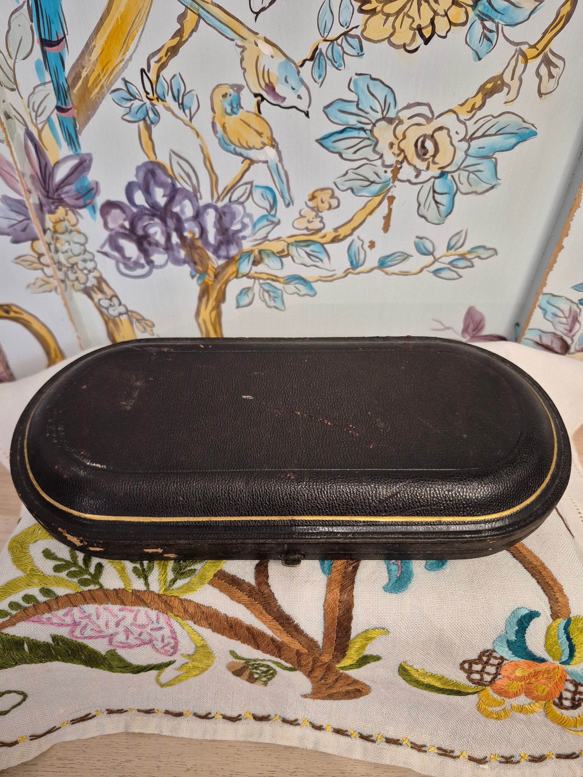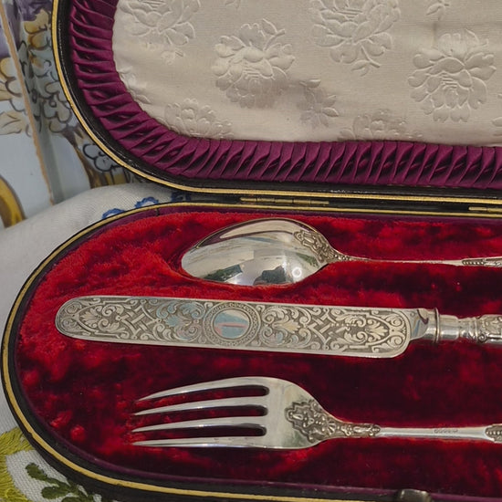A high quality antique silver plated Christening Set by James Dixon and Son c1880. The set consists of a highly decorated knife, fork and spoon in a black leather fitted box lined with red velvet and cream and red silk. The set and the inside of the box are in excellent condition, the outside of the box has a few scuff marks but the catch and hinges are sound.