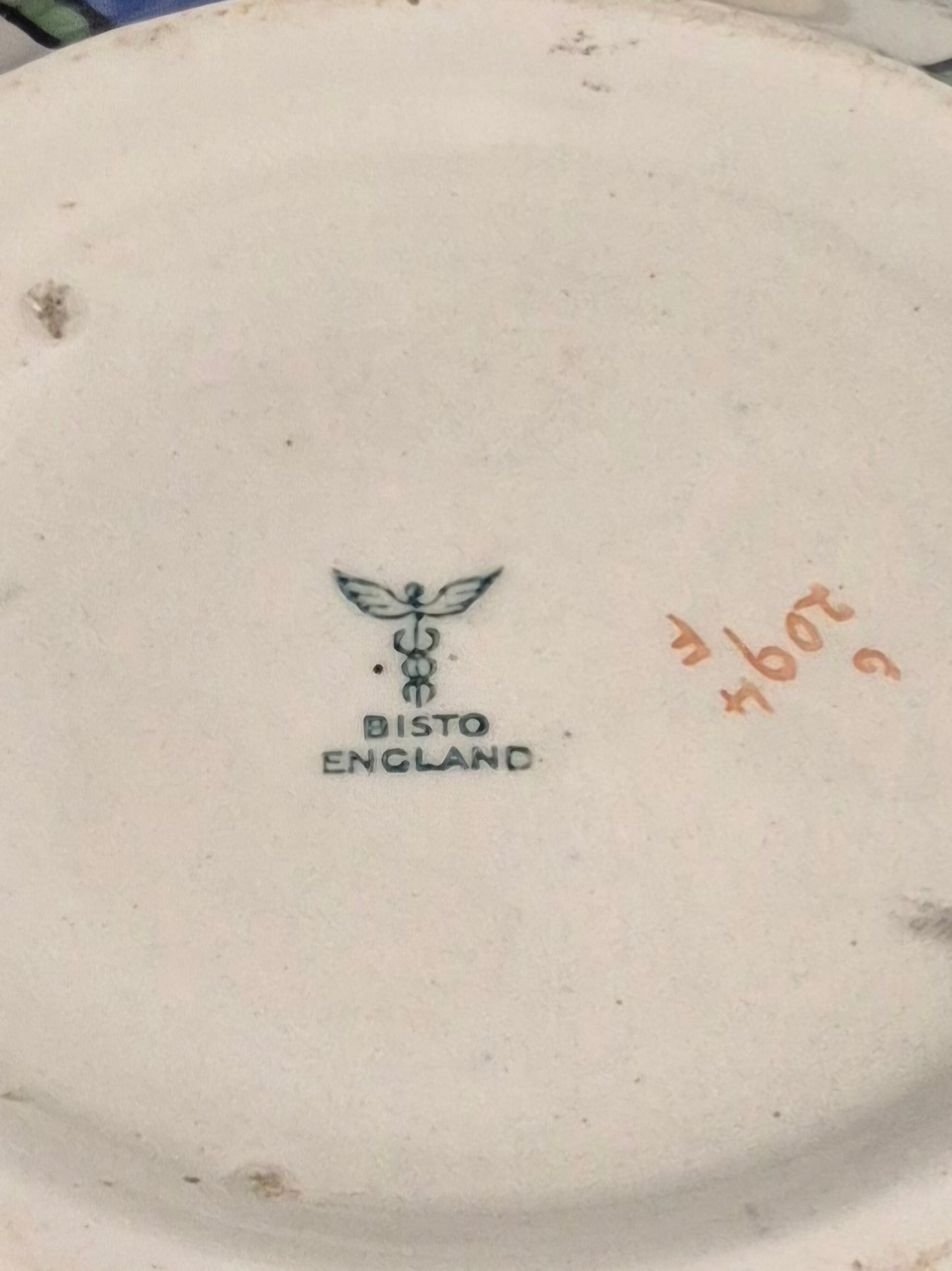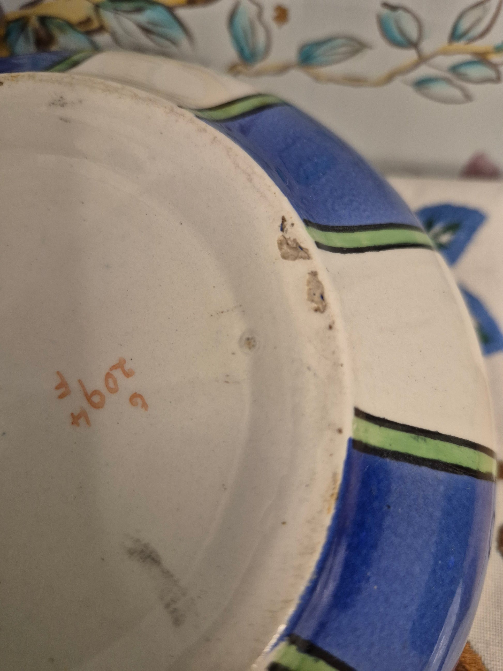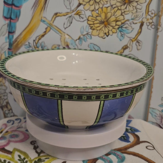 A very nice antique soap or sponge bowl made by Bishop and Stonier c1900. The bowl has broad blue and white stripes and a thinner green stripe around the body. The top rim of the bowl and around the edge of the drainer is decorated with a green and black checkerboard design. The bowl is in excellent condition, there is a rough area on the bottom edge and a very small chip on the top edge of the bowl. Please see last two photos.