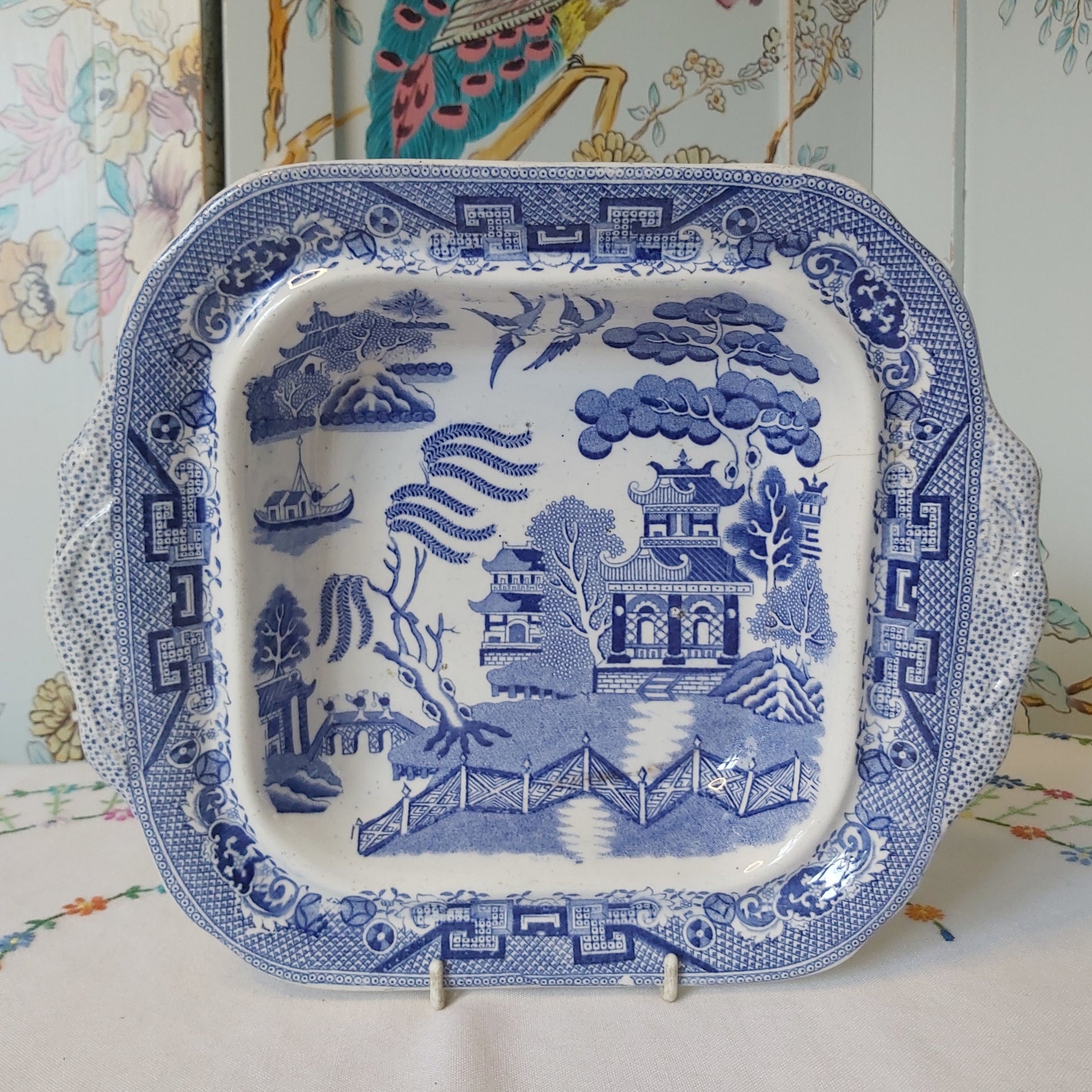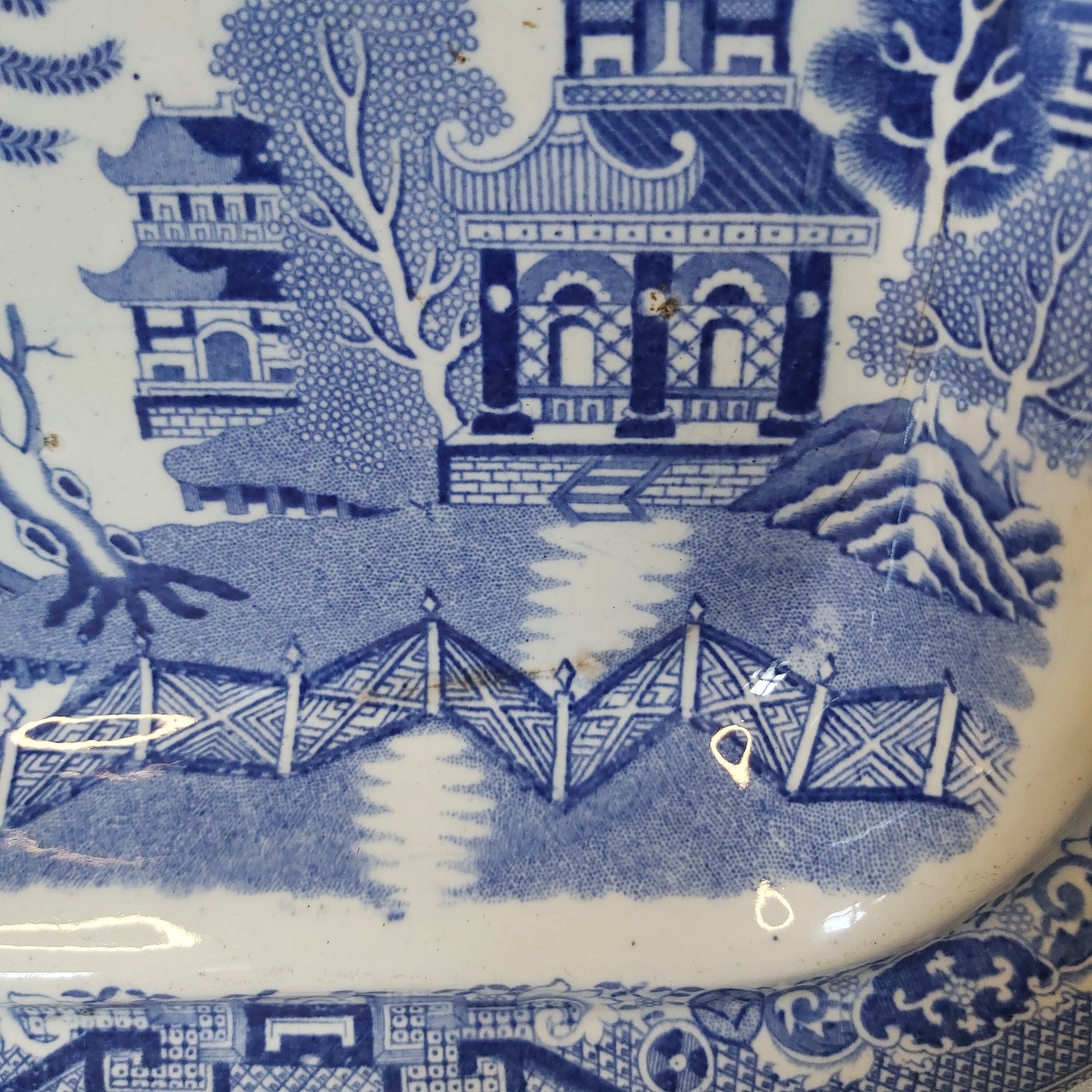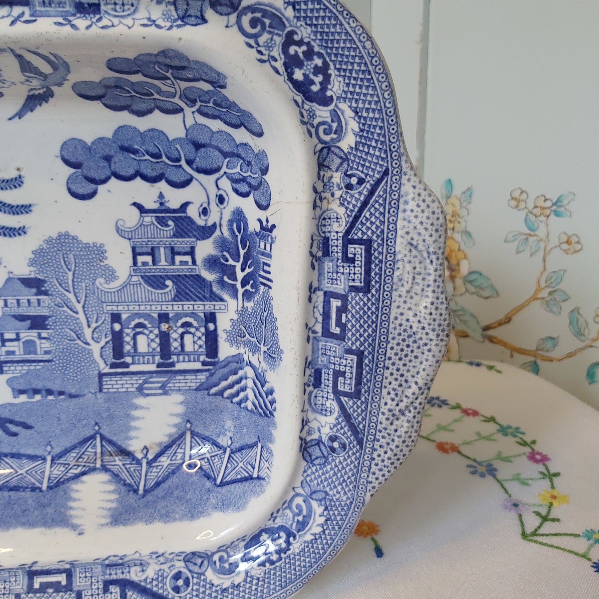 A beautiful antique blue and white earthenware bowl in the classic willow pattern made by Scottish pottery James Jamieson and Co of Bo'ness c1840.