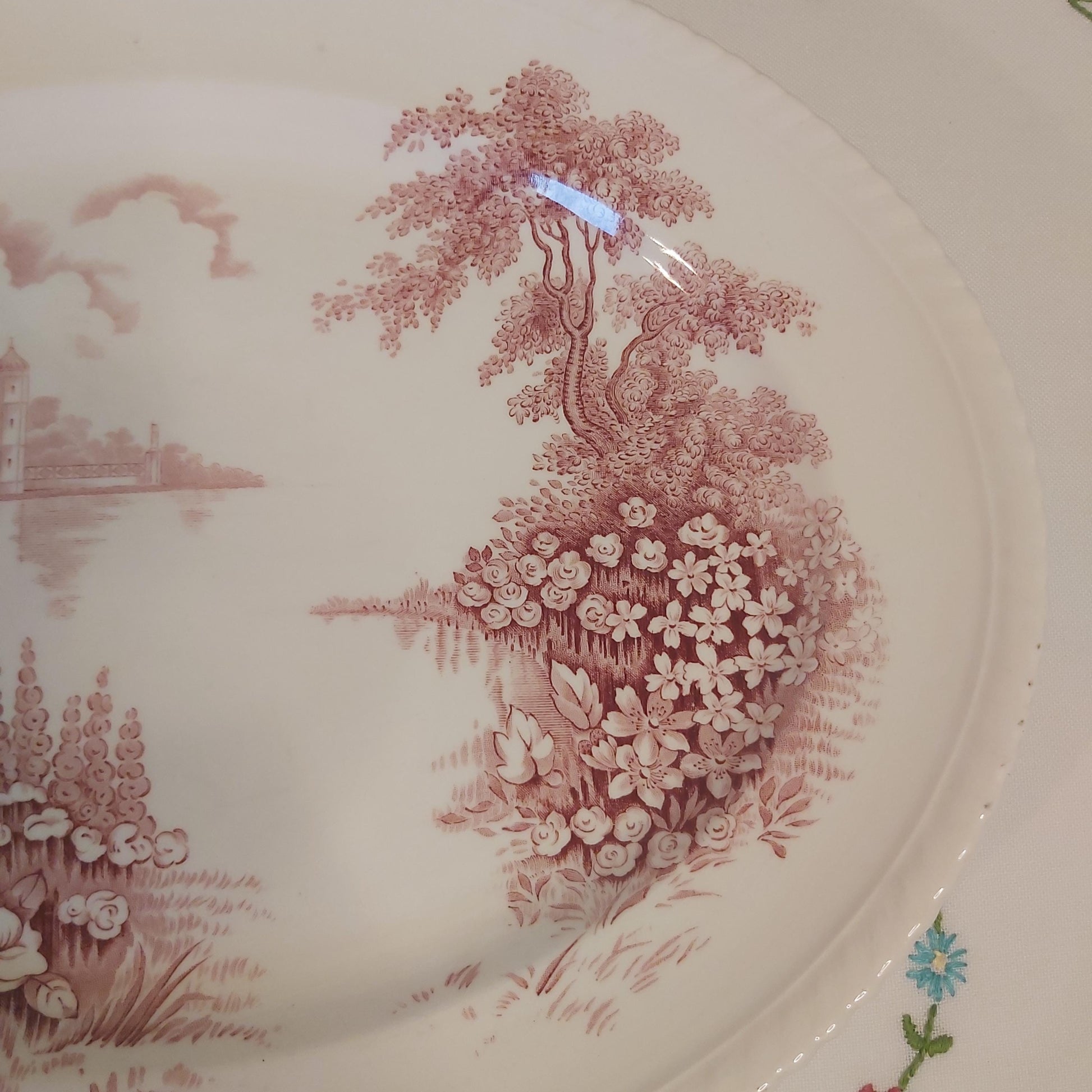 A very nice large pink transferware platter by Johnson Brothers in the 'Castle on the Lake' pattern, c1960s. In perfect condition