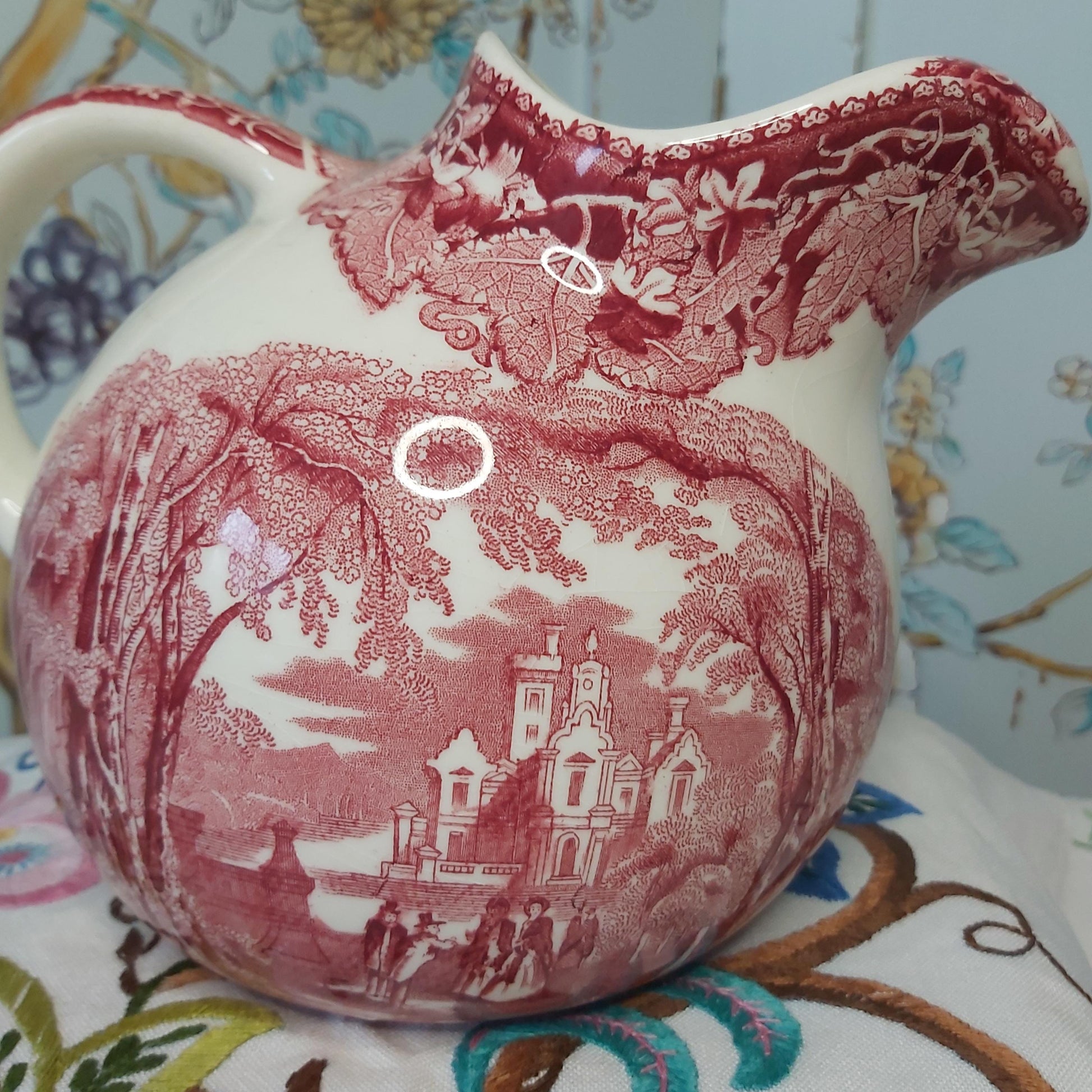 A rare Masons Ironstone Ball Jug with Ice Lip in the red/pink Vista pattern. The jug is in excellent clean condition with just a firing crack around the bottom of the handle which occurred during manufacture (see photo). The jug is large and holds approximately 1 litre. The maker's mark underneath dates the jug to c1930s.
