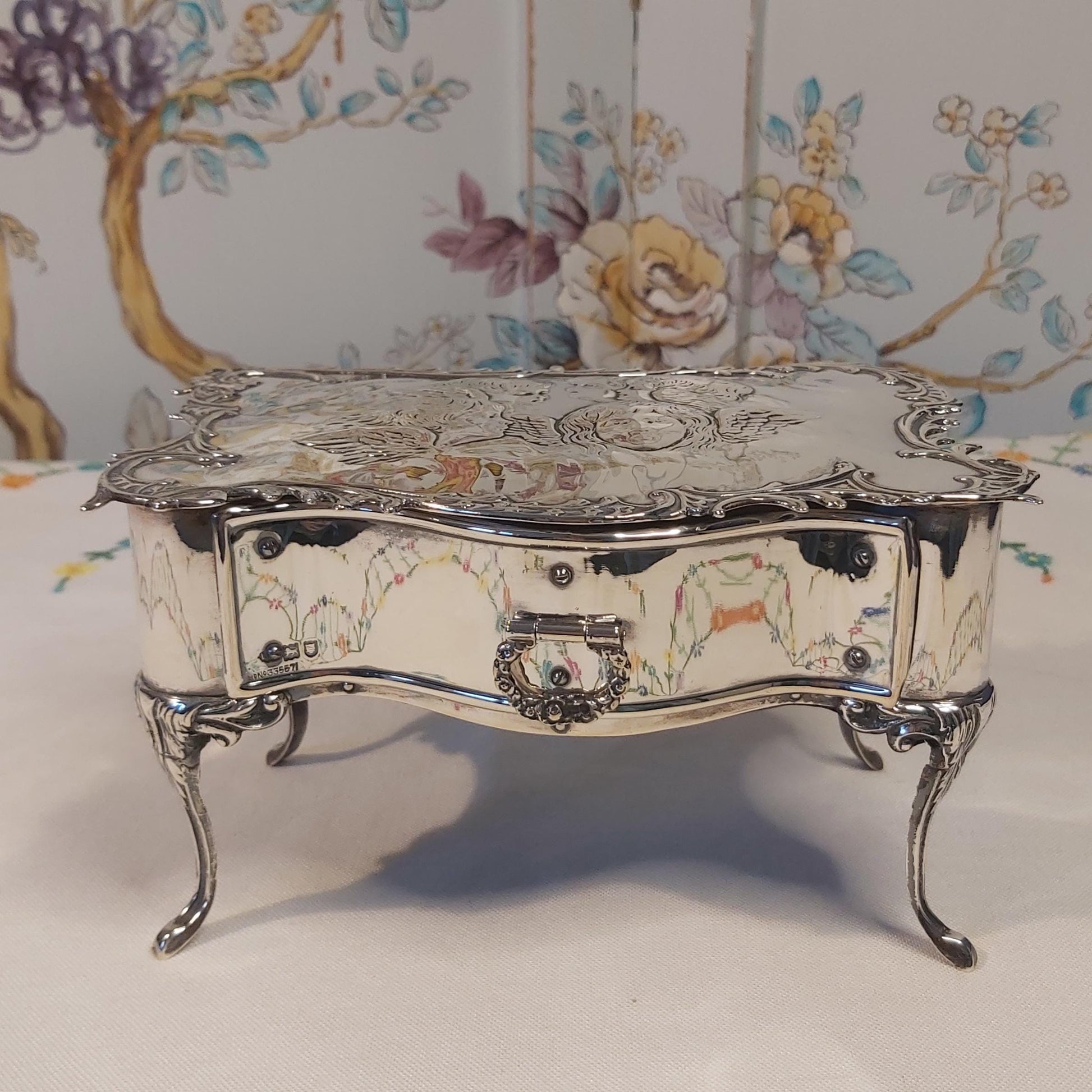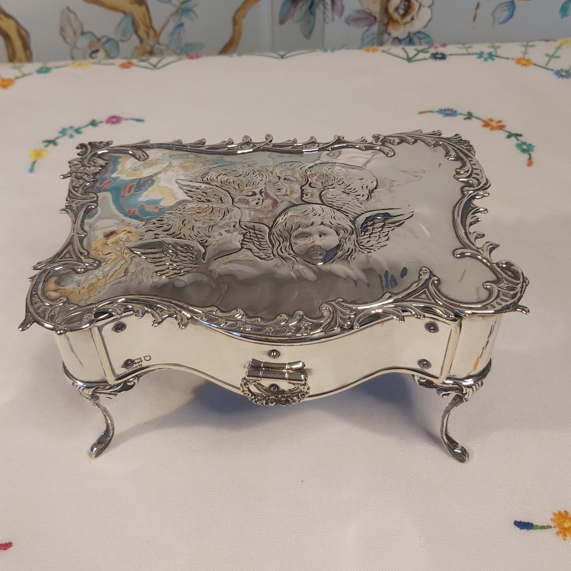 William Comyns Silver Dressing Table Jewellery Box with Reynolds Angels Design, Hallmarked London 1901